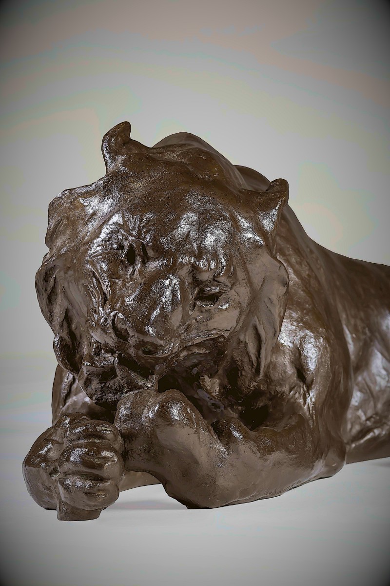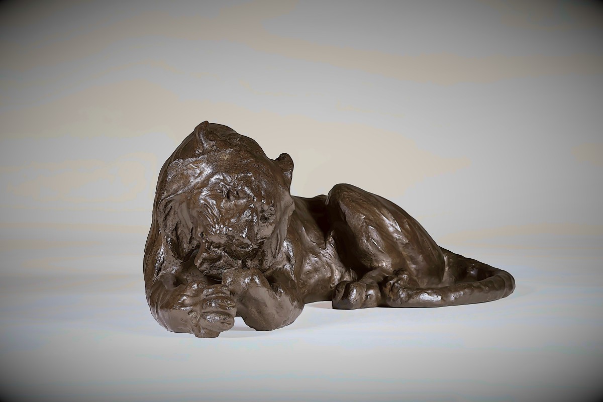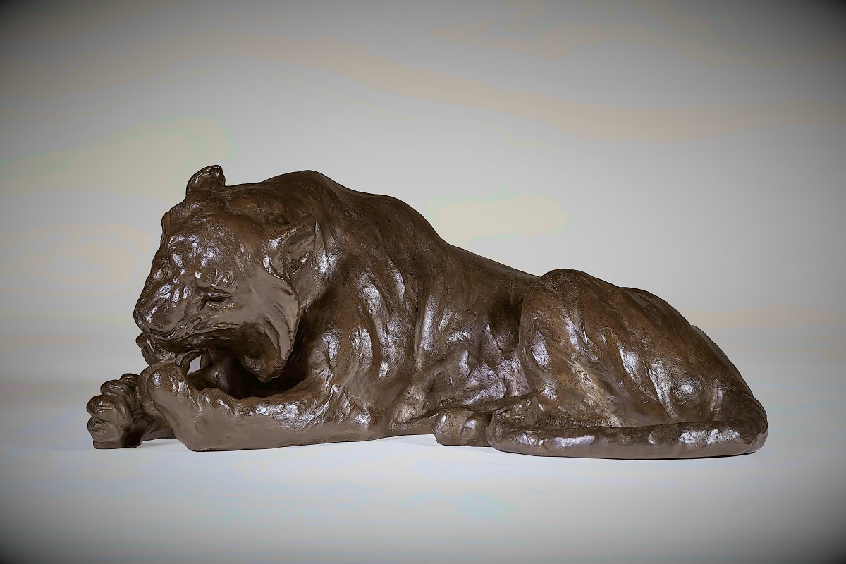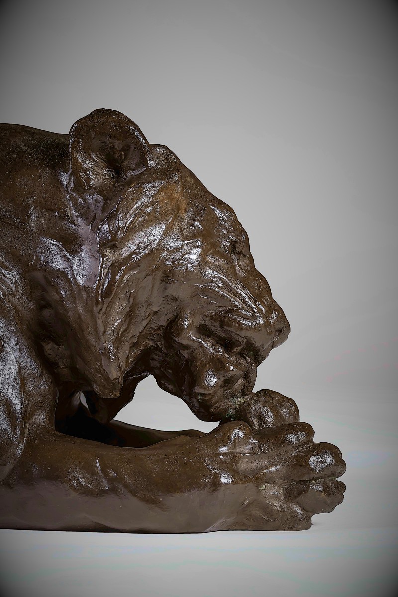 Le modelé est d'une finesse exceptionnelle. La tête s'incline légèrement vers l'avant, les mâchoires doucement entrouvertes, tandis que la langue atteint la patte ; ce petit mouvement anime toute la sculpture. La musculature est rendue par des transitions subtiles plutôt que par des définitions nettes, suggérant la force sous la peau sans exagération. La surface porte une patine douce et nuancée, captant la lumière le long des épaules, des flancs et des ...