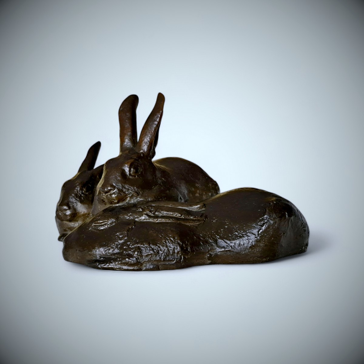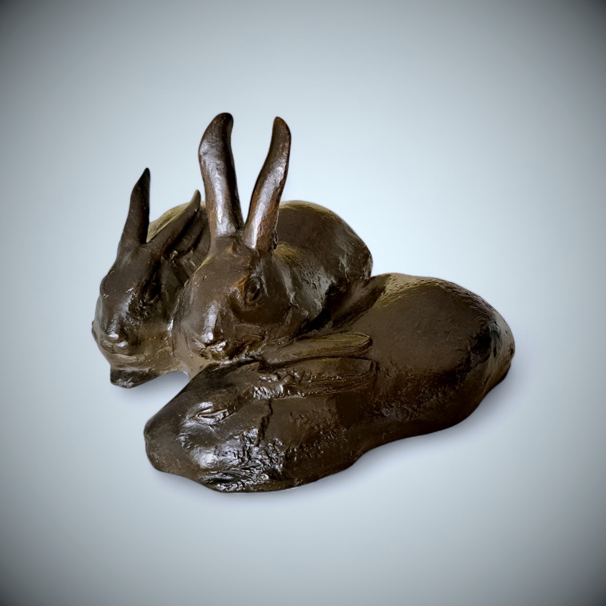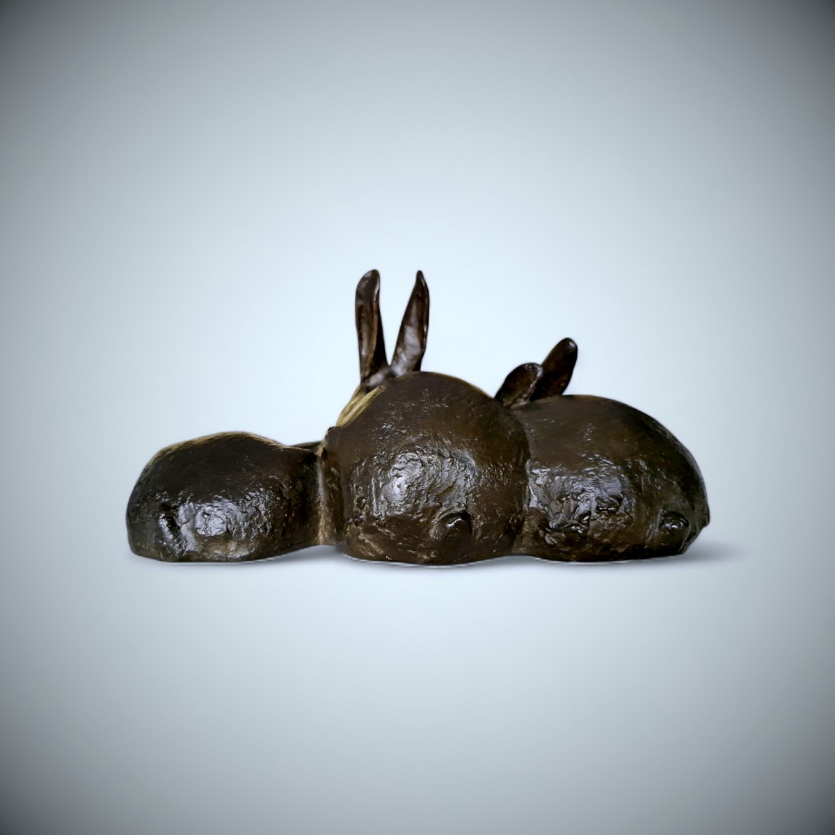 La composition présente trois lapins blottis les uns contre les autres,leurs corps compacts formant une masse horizontale aux ondulations douces. Deux animaux sont assis, les oreilles dressées et le regard attentif, tandis que le troisième est plus bas, la tête rentrée dans une posture plus calme. Cette subtile variation de posture introduit un rythme paisible au sein du groupe etanime cette composition par ailleurs sereine. Plutôt que d'isoler chaque animal, Misawa les unit en un tout sculptural harmonieux, suggérant chaleur,camaraderie et la proximité instinctive ...