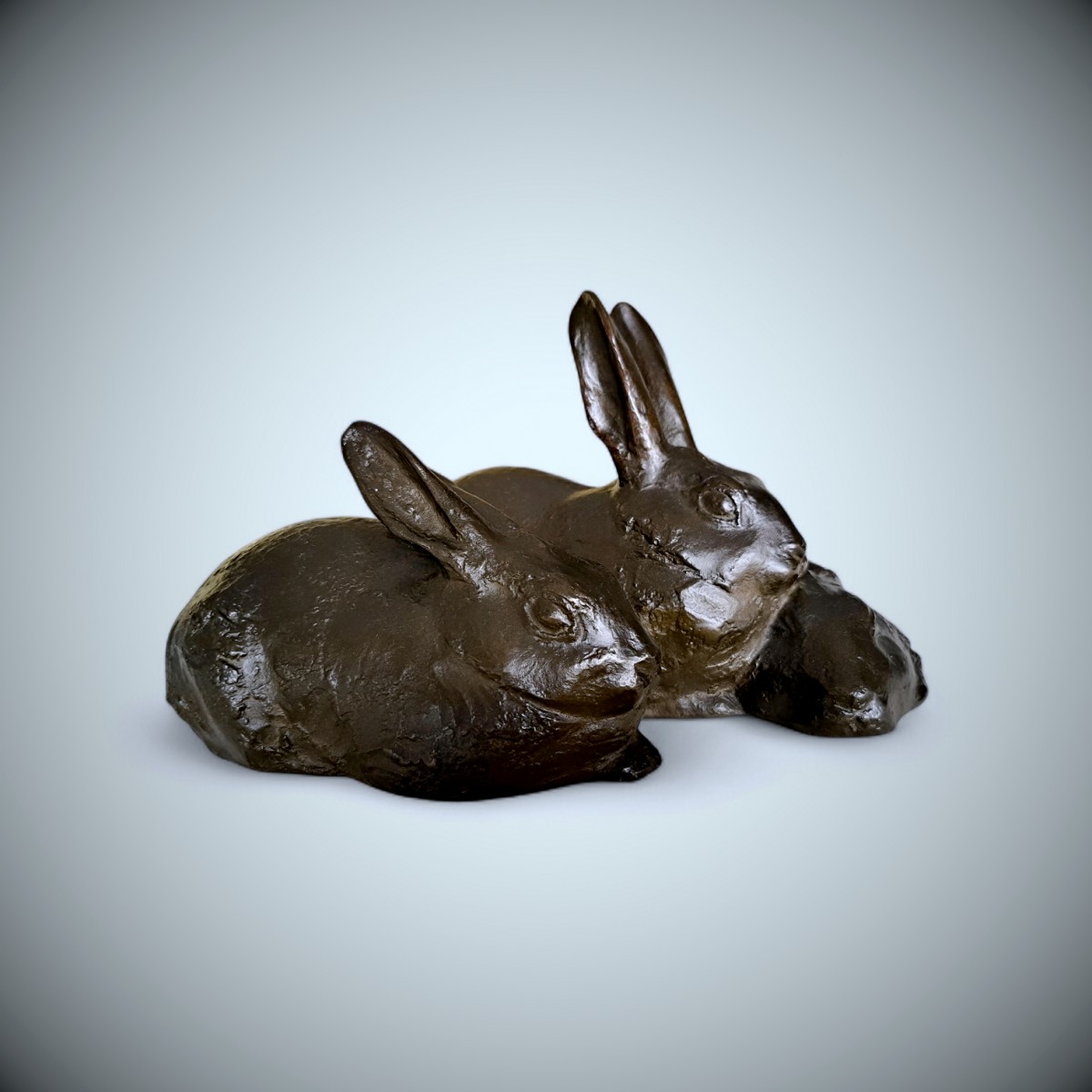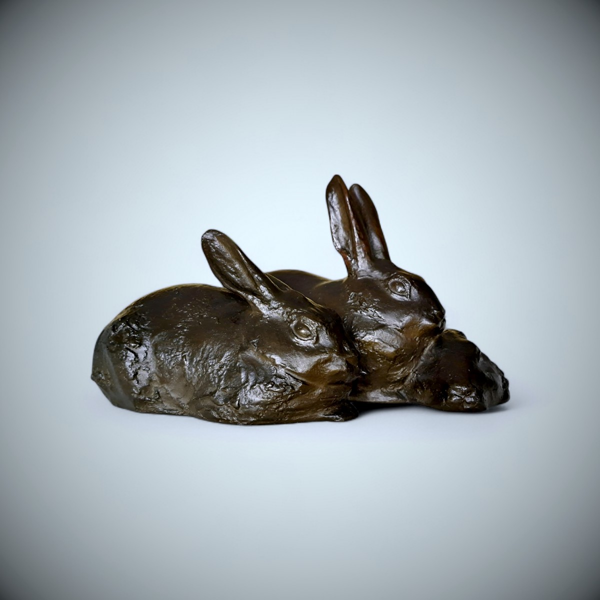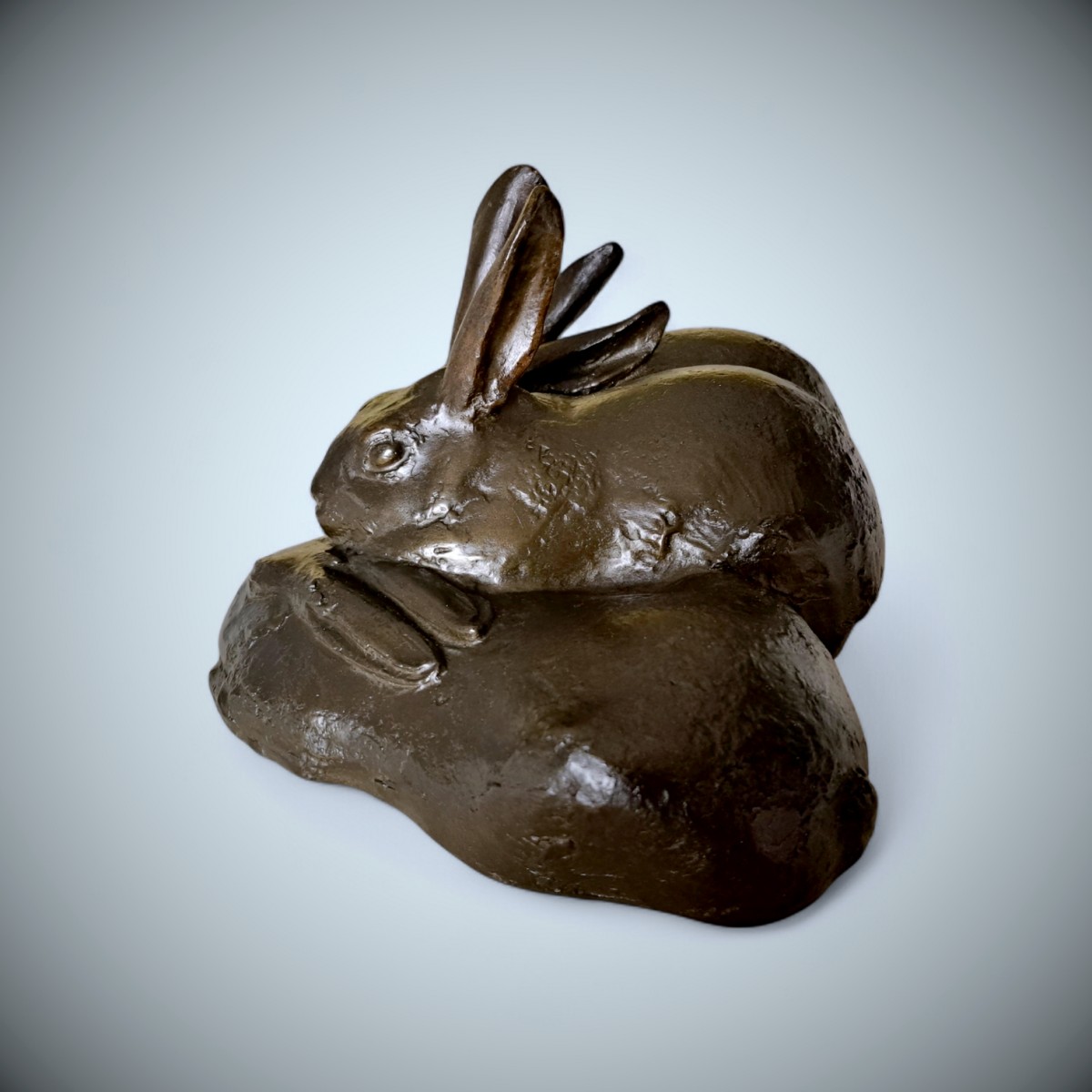 La composition présente trois lapins blottis les uns contre les autres,leurs corps compacts formant une masse horizontale aux ondulations douces. Deux animaux sont assis, les oreilles dressées et le regard attentif, tandis que le troisième est plus bas, la tête rentrée dans une posture plus calme. Cette subtile variation de posture introduit un rythme paisible au sein du groupe etanime cette composition par ailleurs sereine. Plutôt que d'isoler chaque animal, Misawa les unit en un tout sculptural harmonieux, suggérant chaleur,camaraderie et la proximité instinctive ...