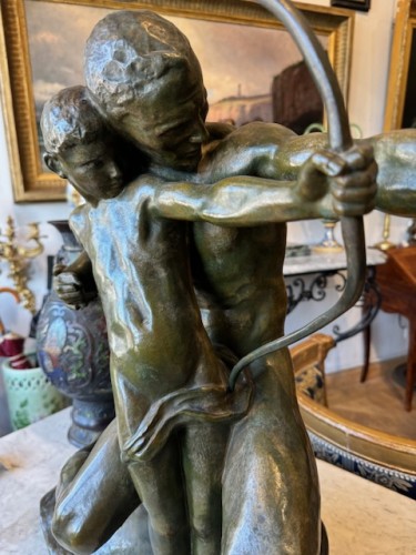 Bronze patine verte représentant le père le fils ( la Leçon )daté 1930 et signé Amedeo Gennarelli, né en 1881 à Naples et mort en 1943. Gennarelli est un sculpteur italien de l'art déco, élève de Francesco Jerace. En 1909, il émigre en France où il s'installe à Paris. Il est célèbre pour ses nus féminins. Il expose sa première œuvre en 1913 au Salon de la Société des artistes français, où il expose régulièrement jusqu'en 1936. Pour son travail, il utilise des matériaux tels que le bronze, le marbre, la céramique .