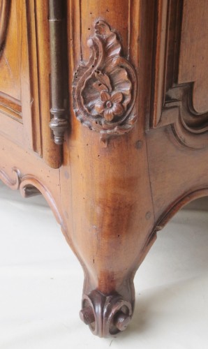 Ce buffet de chasse en noyer est galbé sur trois faces, il ouvre par deux portes à grand cadre, grassement moulurées sur le pourtour et pourvues de panneaux à double plates bandes, les cotés évasés sont eux aussi dotés d' importantes moulures sinueuses et de panneaux à double plates bandes, la traverse basse en façade est chantournée et sculptée d'une importante coquille ajourée d'où partent, de part et d'autre, des peignés et des rameaux fleuris, le faux dormant est orné dans sa partie basse d'une coquille et les montants sont sculpté de feuilles d'acanthe et de fleurettes, ils se terminent par des pieds en volute, les pieds arrières sont en demi volute. Le meuble est coiffé d'un plateau en marbre bleu turquin. En bon état de conservation ce buffet n'a subi que peu de restaurations, la traverse arrière basse a été changée et son plancher remanié.