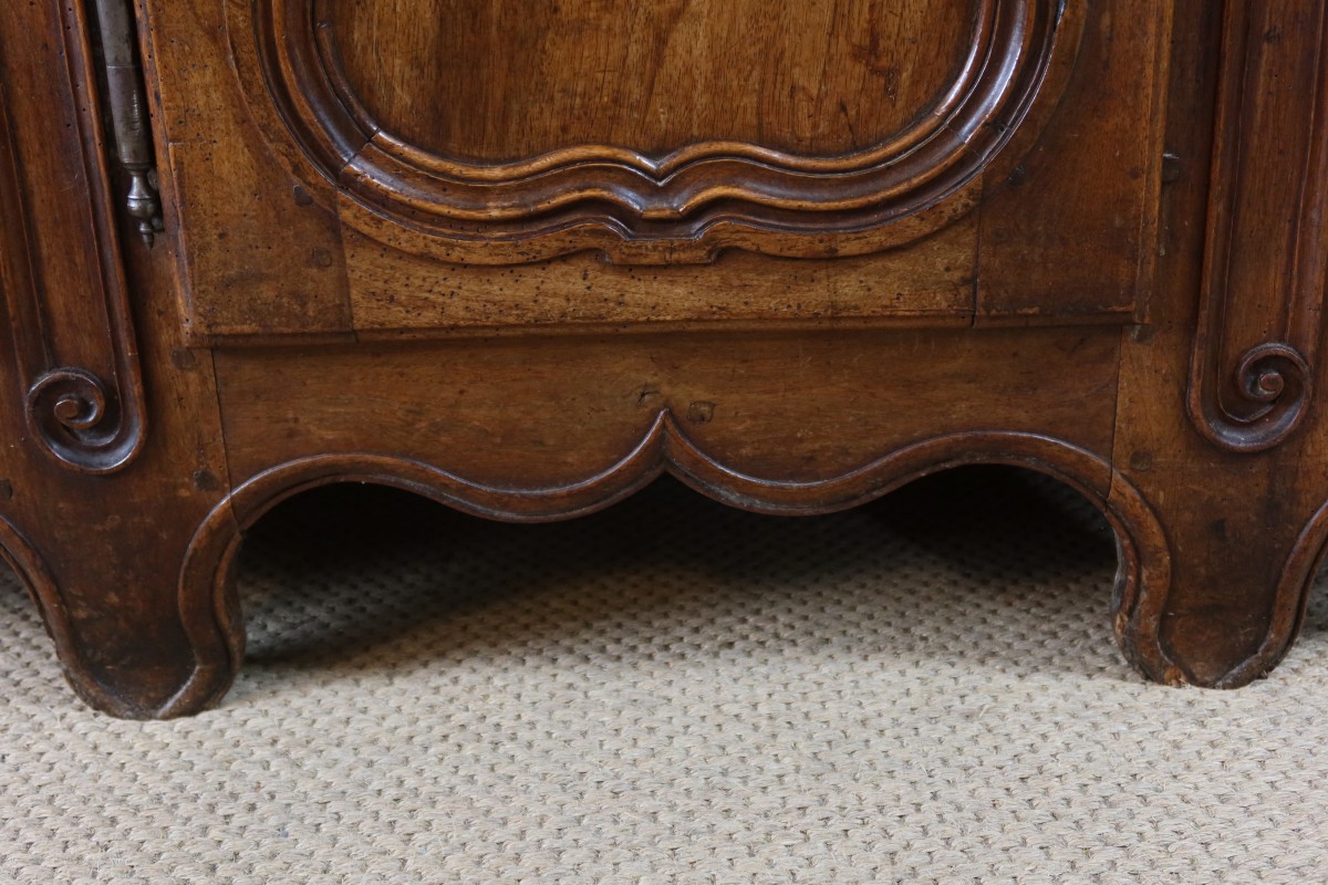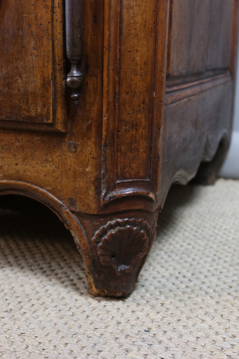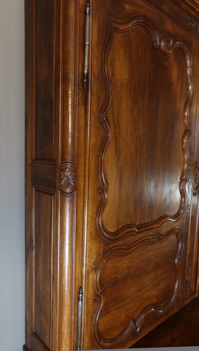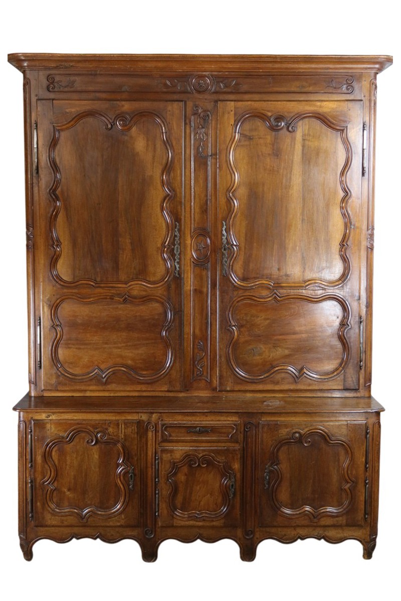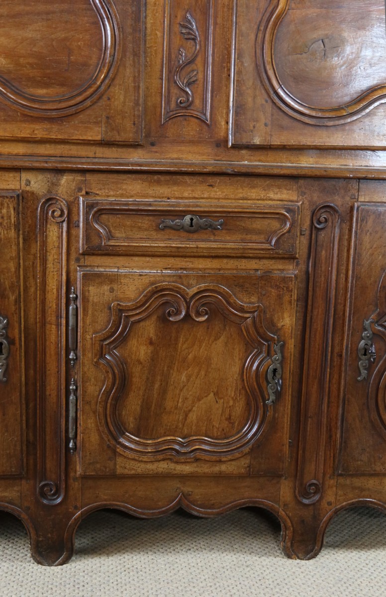 Buffet deux corps en noyer Louis XV époque XVIIIème siècle. Ce meuble à deux corps ouvre par trois portes et un tiroir dans la partie basse et par deux portes dans la partie haute munie de quatre rayonnages. Très belle sculpture sur l'ensemble du buffet. L'intérieur du fond de la partie supérieure est panneautée. Ce meuble est entièrement dans son état d'origine avec des traces d'usage. DIMENSIONS: 1,90m x 0,61m et 2,56m de hauteur. La partie haute: 1,76m de hauteur et 0,34m de profondeur. La partie basse: 0,80m de hauteur.