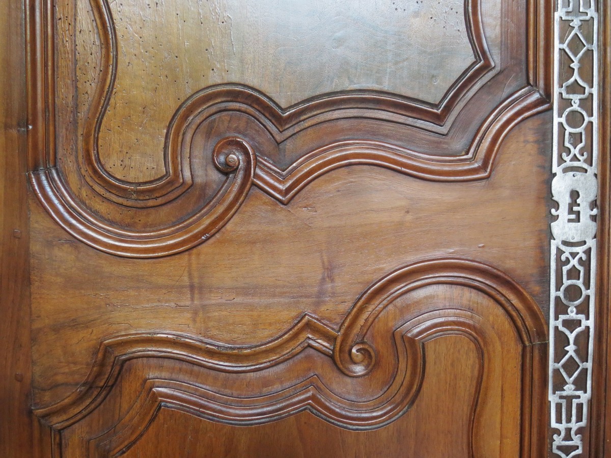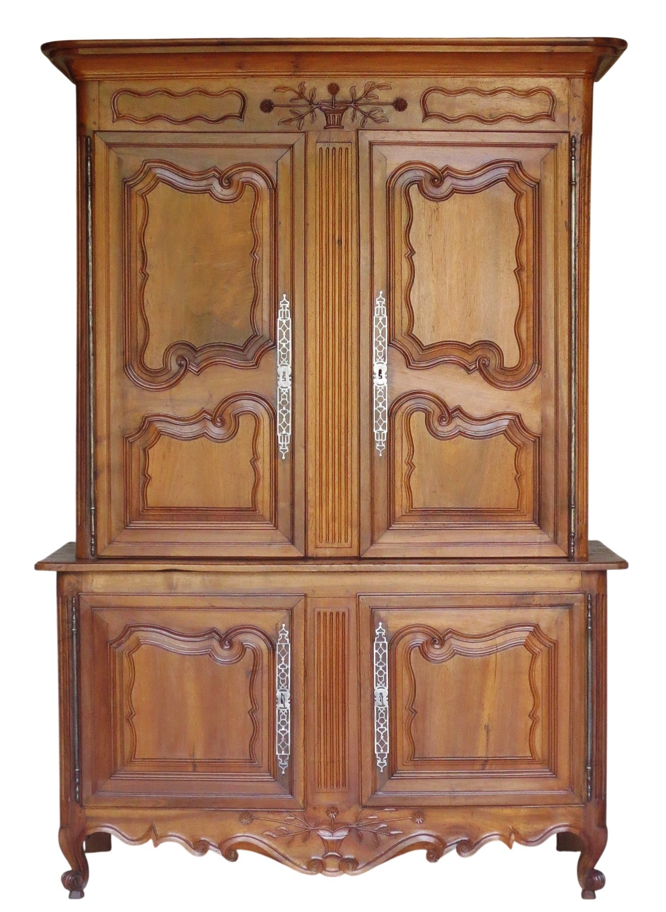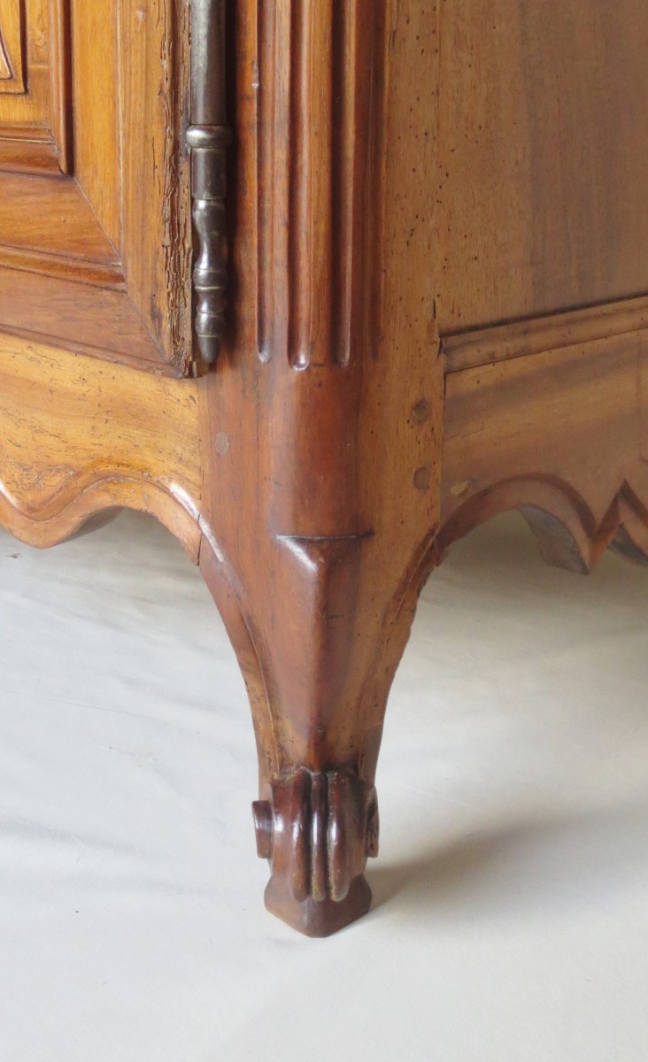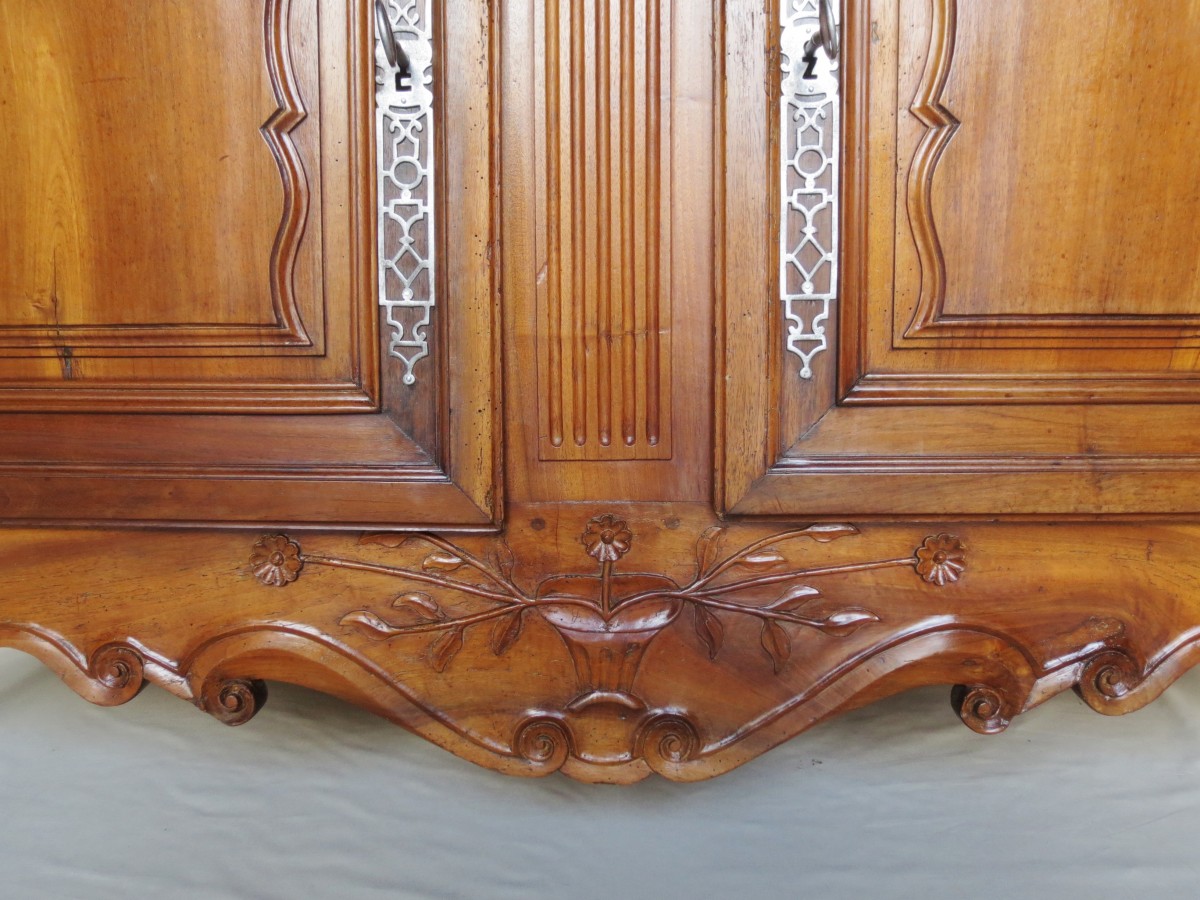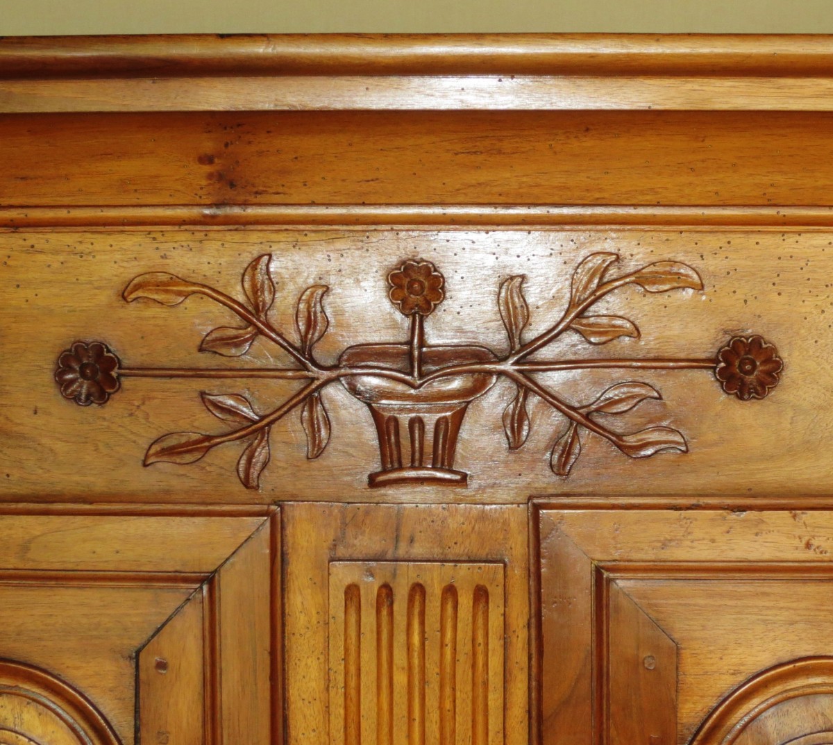 Ce buffet de style Louis XV est en noyer massif, il ouvre en partie basse par deux portes et le corps du haut en retrait ouvre lui aussi par deux portes. L'ensemble est généreusement mouluré et chantourné, les portes sont montées à grand cadre et leurs panneaux sont à double plates-bandes dont l'une est agrémentée d'une petite doucine. Les traverses hautes et basses sont sculptées de vases stylisés et de fleurettes. En excellent état de conservation ce meuble a conservé sa corniche et ses pieds antérieurs, les deux pieds postérieurs ont subi une petite enture. Son noyer, de couleur miel, possède une très belle patine blonde.