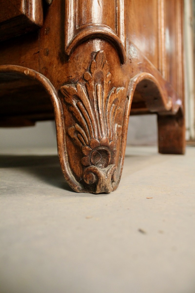 Le faux dormant est fixe. La traverse du bas est sculptée d'une coquille et de fleurs. Les pieds escargots sont surmontés d'une sculpture en feuille d'acanthe.