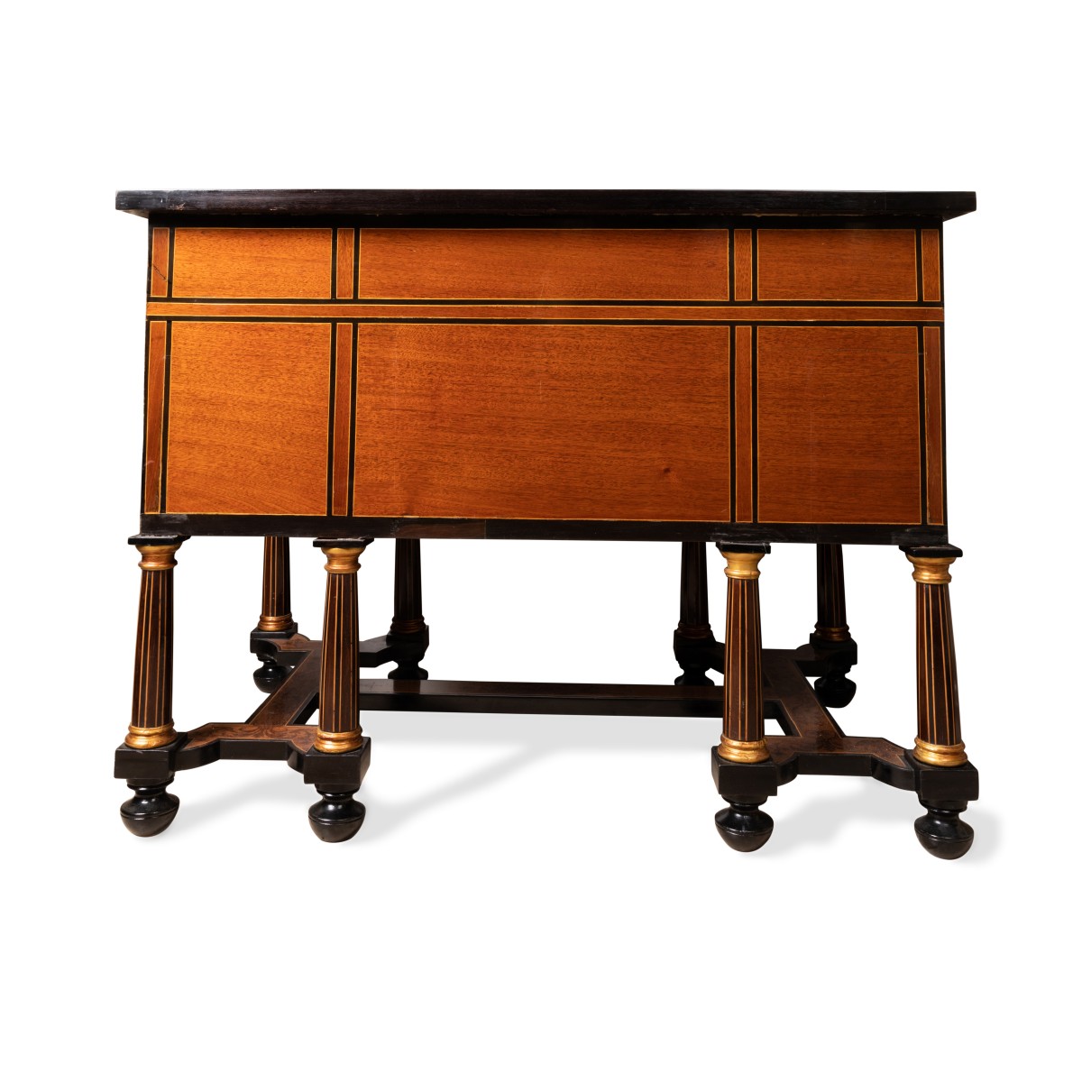 Bureau dit Mazarin à dessus brisé , en placage de bois indigènes et ébène ,richement marqueté d'arabesques et de rinceaux autour de filets d'ébène .