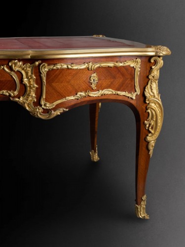 Bureau plat de style Louis XV vers 1870 dit "du Dauphin" en placage d'amarante et bronze doré.