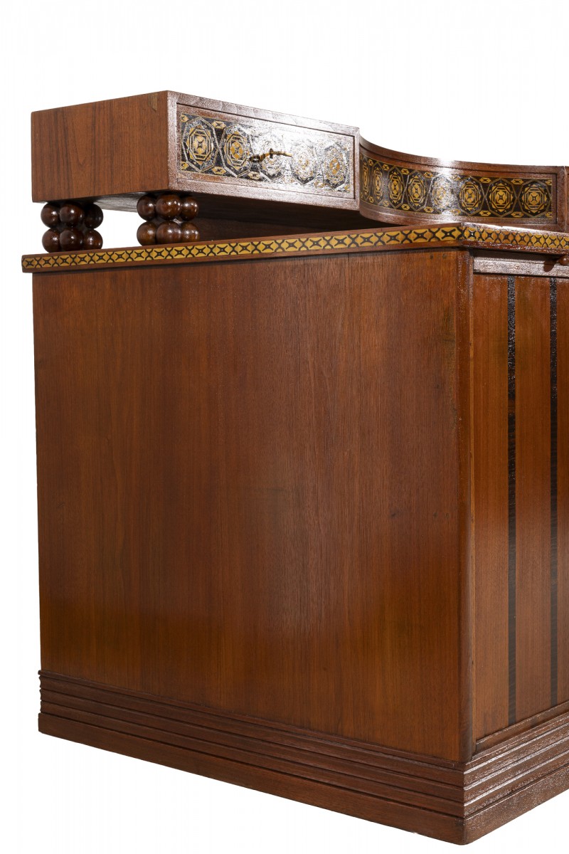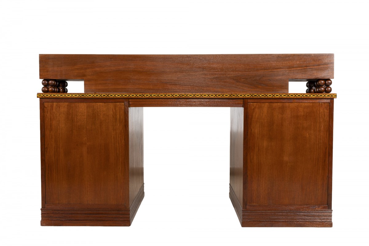 L'un des meubles préférés de notre galerie est ce bureau, inspiré d'un modèle de Josef Maria Olbrich et richement décoré d'incrustations. Ce modèle était si célèbre qu'il a été repris par le célèbre fabricant de meubles M. Ballin à Munich et modifié par l'architecte Mathias Feller. Notre bureau possède ses