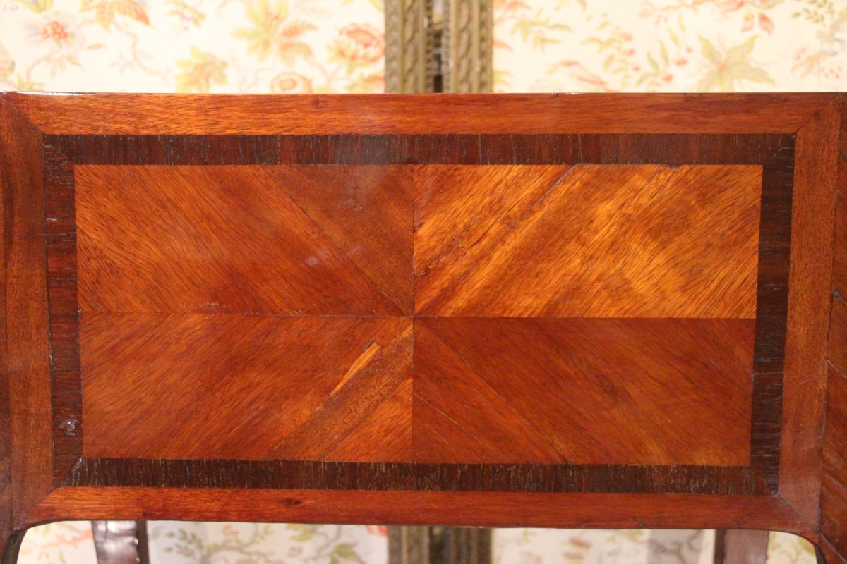 Délicieux petit bureau de pente d'enfant en bois de satiné, palissandre et bois de rose ouvrant par un tiroir en façade, reposant sur quatre pieds cambrés.