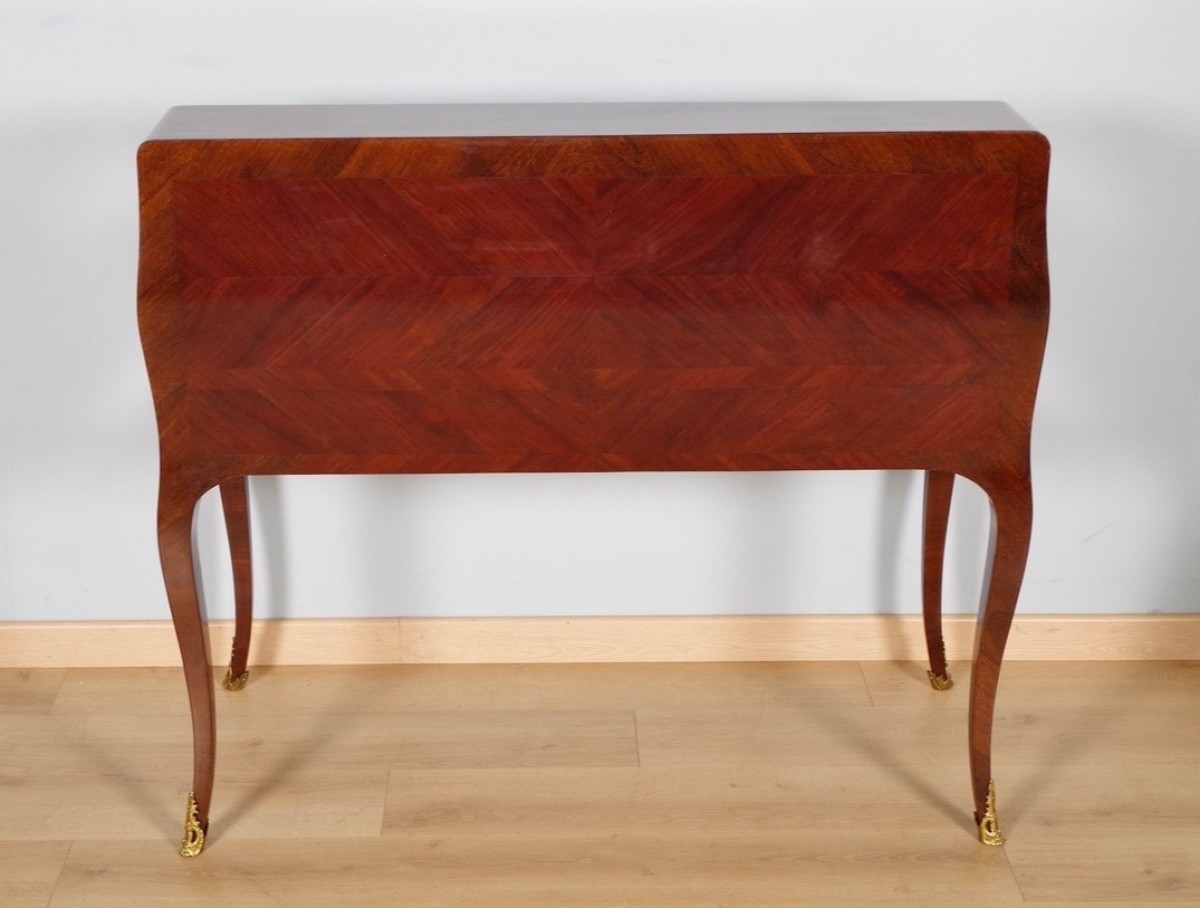 L'abattant chantourné découvre un intérieur en acajou : six petits tiroirs et un secret.