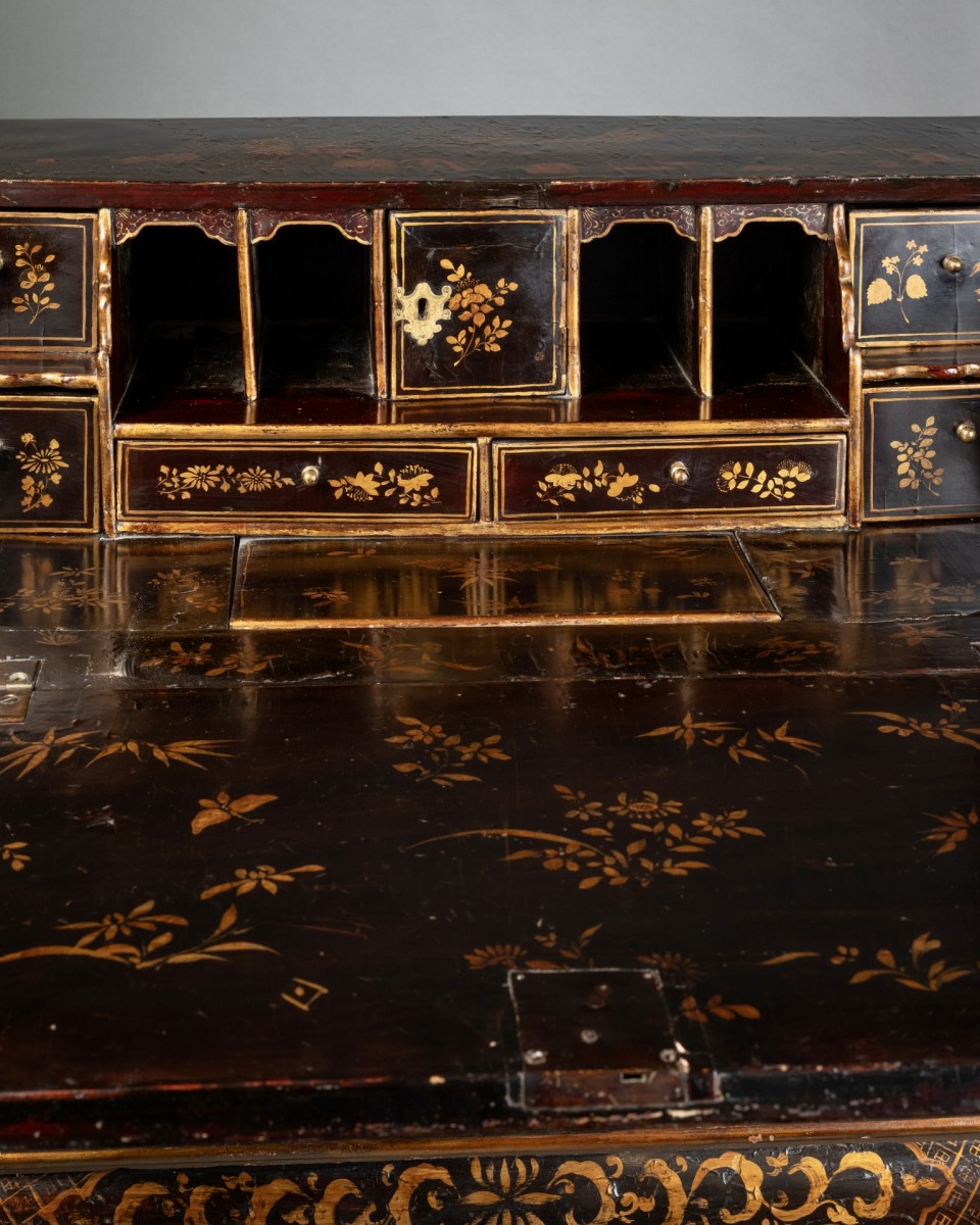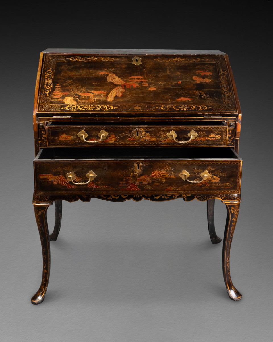 ... front desks » alors en vogue à Londres sous les règnes de George II et George III.?Des idéogrammes chinois tracés à l’encre dans les fonds de tiroirs confirment cependant une production orientale, probablement issue des ateliers de Canton.