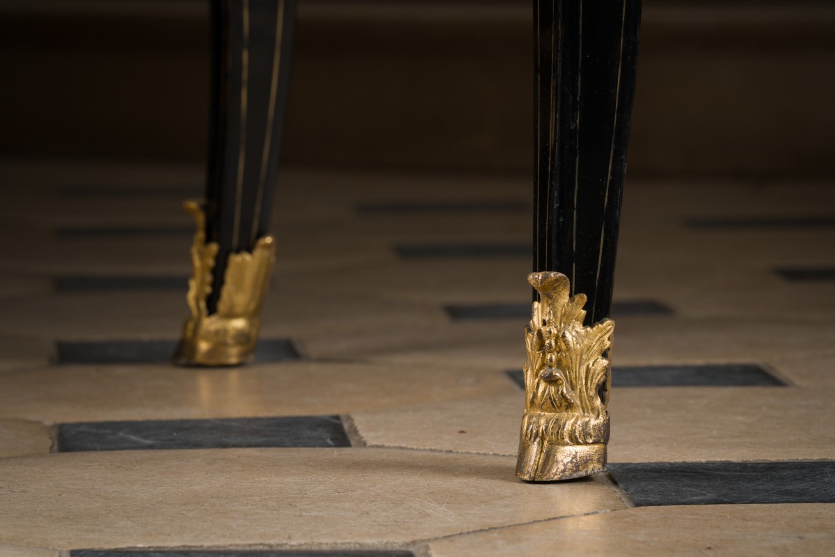 Il repose sur quatre pieds galbés terminés par des sabots de bronze doré en pied de biche. Le dessus de cuir havane doré aux petits fers (rapporté). Les poignées et entrées de serrures sont en bronze ciselé et doré.