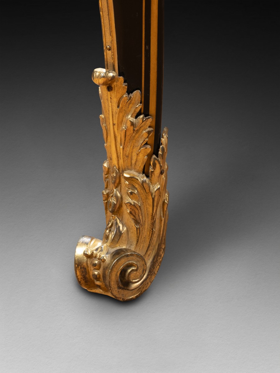Chaque tiroir présente un encadrement en bronze à frises végétales ; les tiroirs latéraux avec des poignées tombantes à tores de lauriers ; rosaces d’acanthes et entrées de serrures à mufles de lions ; le tiroir central avec une importante palmette ajourée qui fait office d’entrée de serrure.
