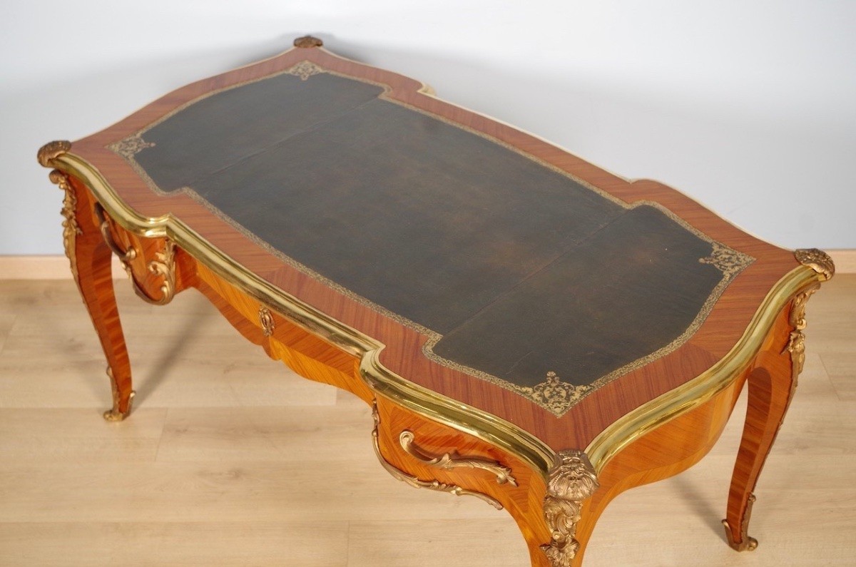 Beau bureau plat en placage de bois de rose et bronze doré.