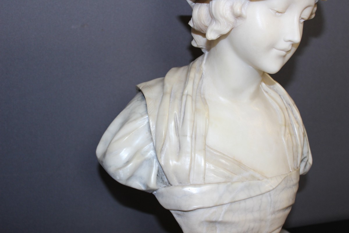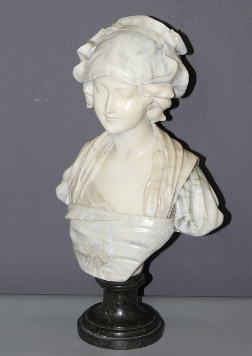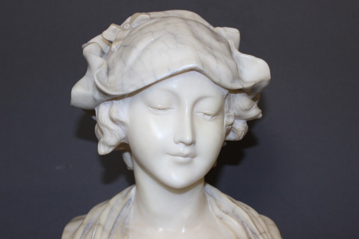 Retrouver le mobilier ou les objets d''art similaires à « Buste de jeune femme en albâtre d'après Greuze vers 1900 » présenté par Antiquités Christophe Rochet, antiquaire à Villeurbanne dans la catégorie Sculpture en Marbre Art nouveau, Sculpture.