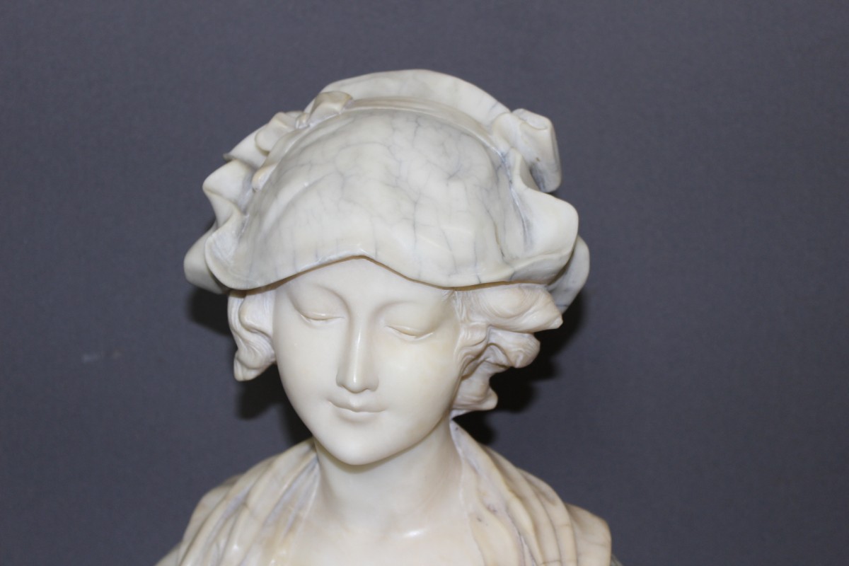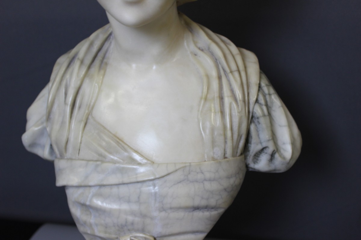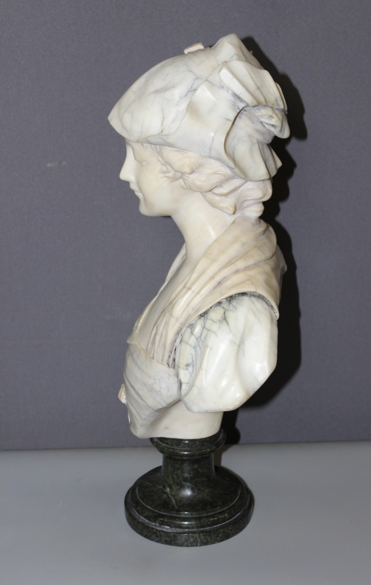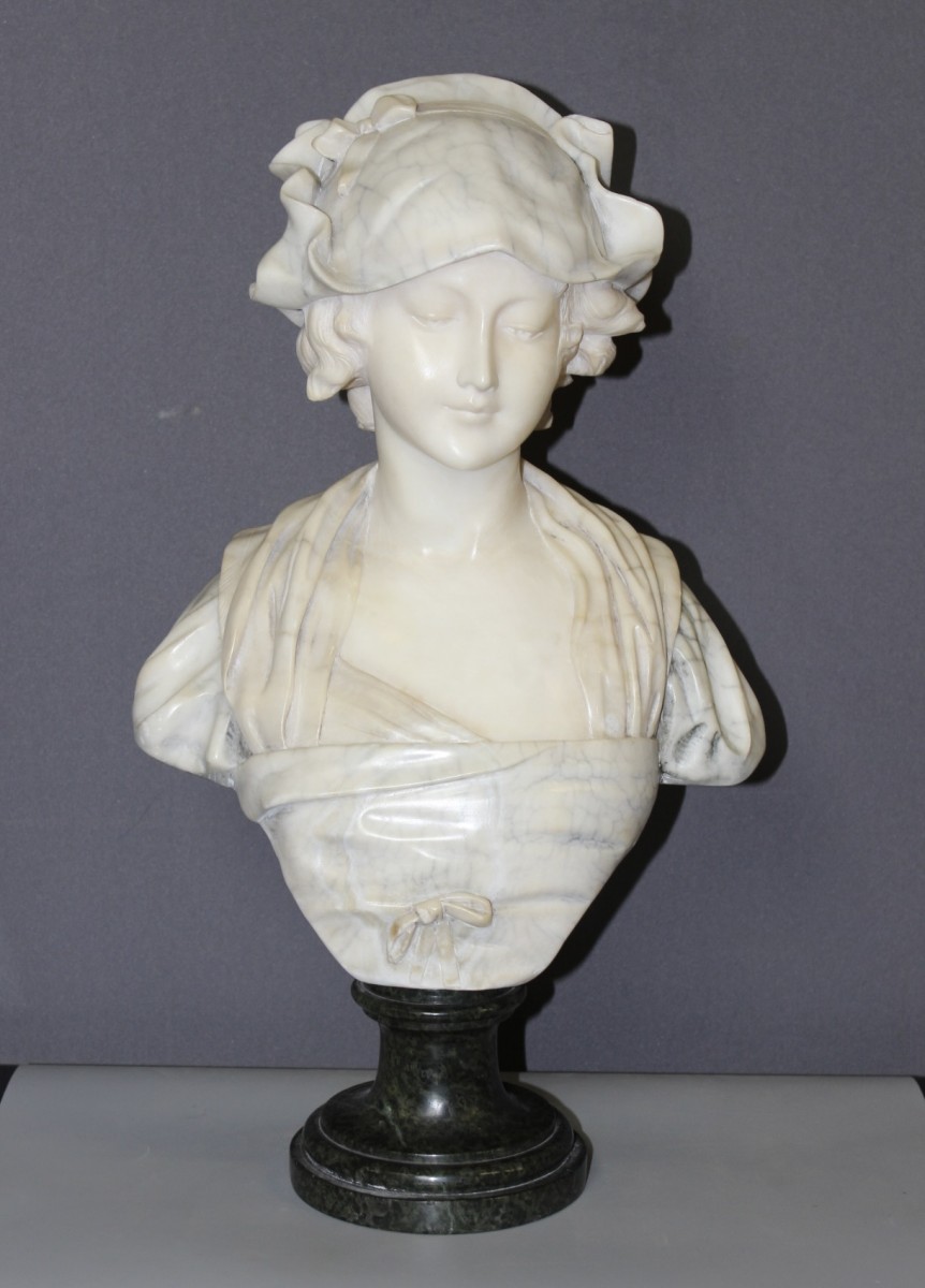 Retrouver le mobilier ou les objets d''art similaires à « Buste de jeune femme en albâtre d'après Greuze vers 1900 » présenté par Antiquités Christophe Rochet, antiquaire à Villeurbanne dans la catégorie Sculpture en Marbre Art nouveau, Sculpture.