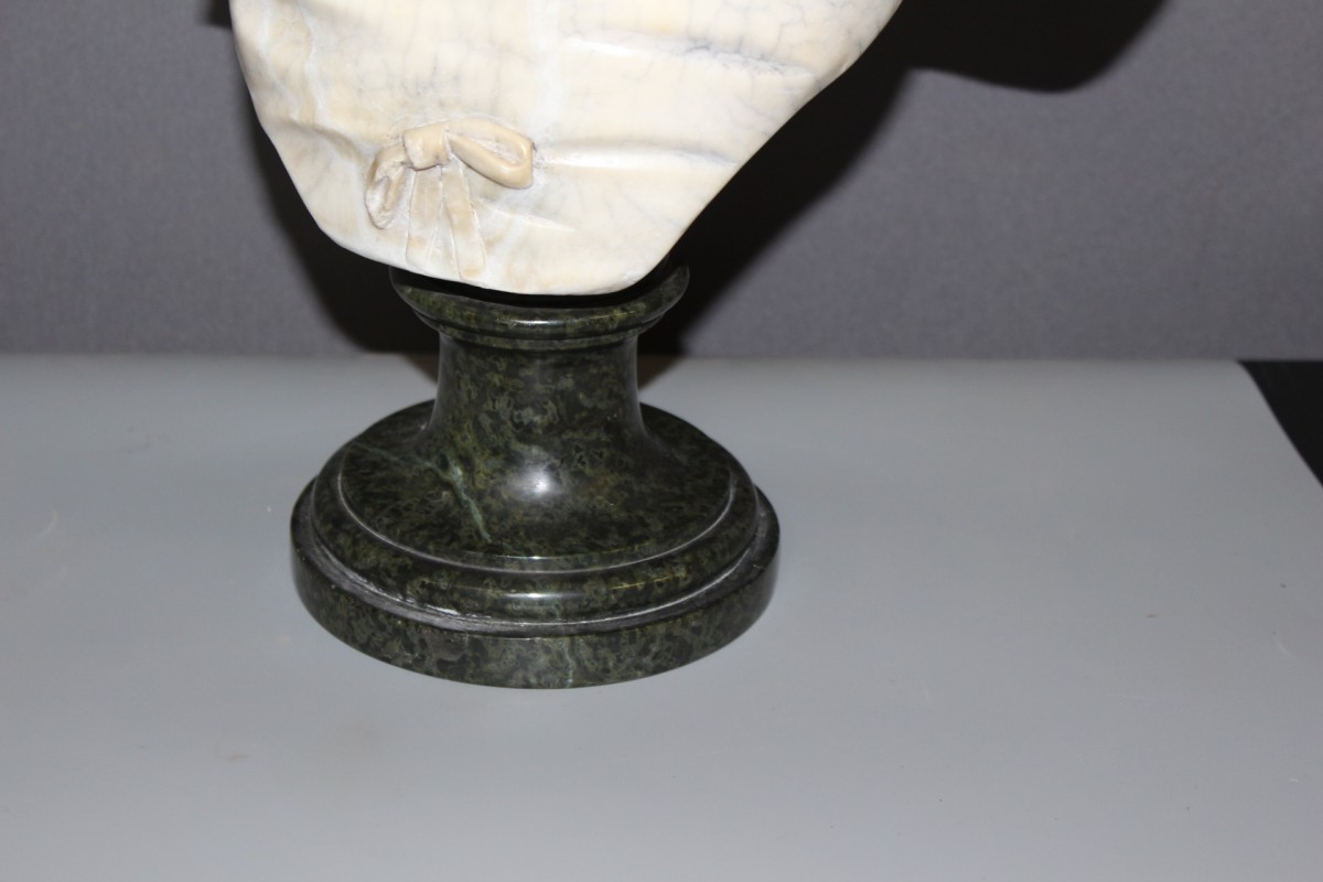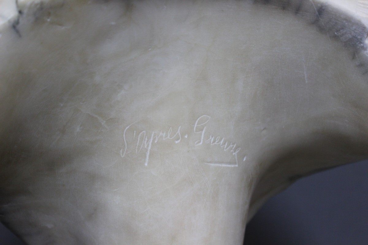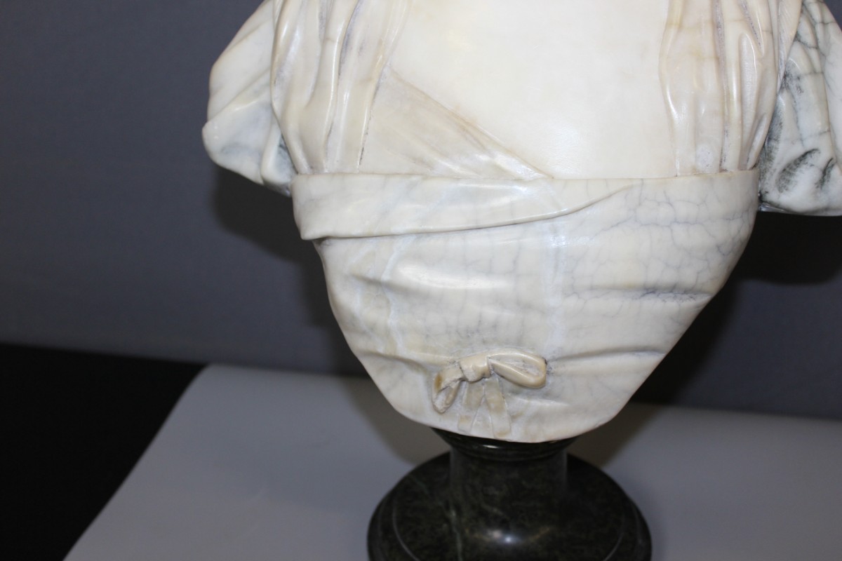 Buste de jeune femme en albâtre à deux couleurs , piètement en marbre vert , signé au dos "d'après Greuze " pour Jean Baptiste Greuze 1725/1805 , socle tournant , ensemble en très bon état