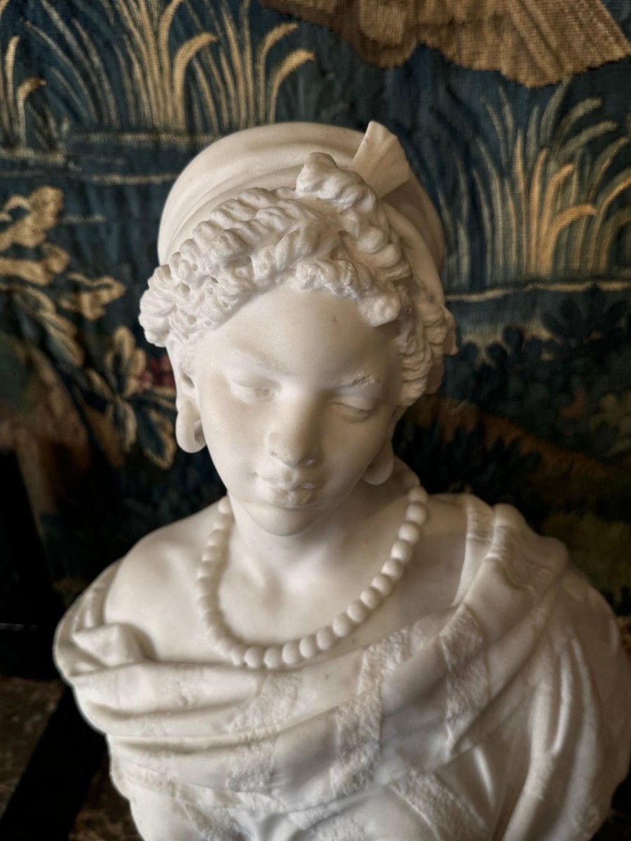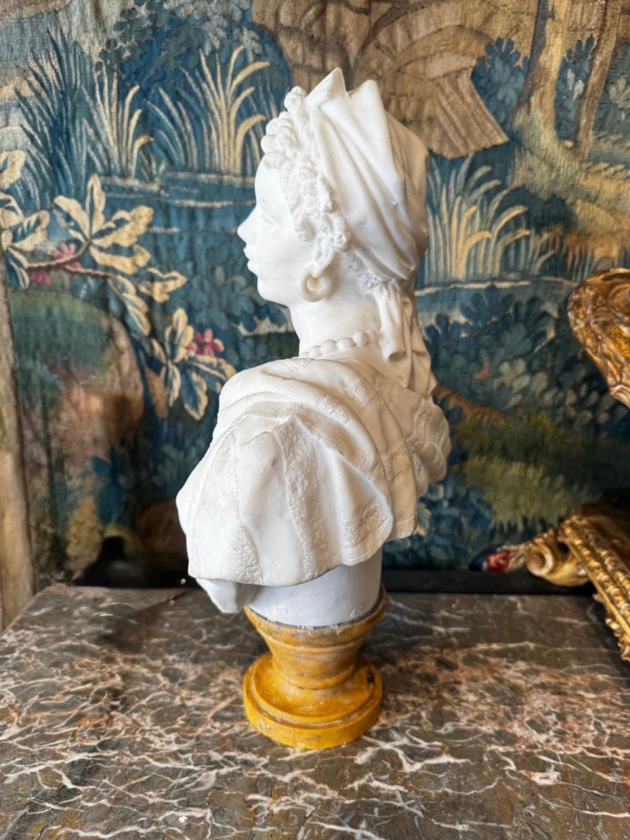 Buste de jeune femme aux cheveux retenus par un foulard, portant de grandes boucles d'oreilles et un collier de perles.