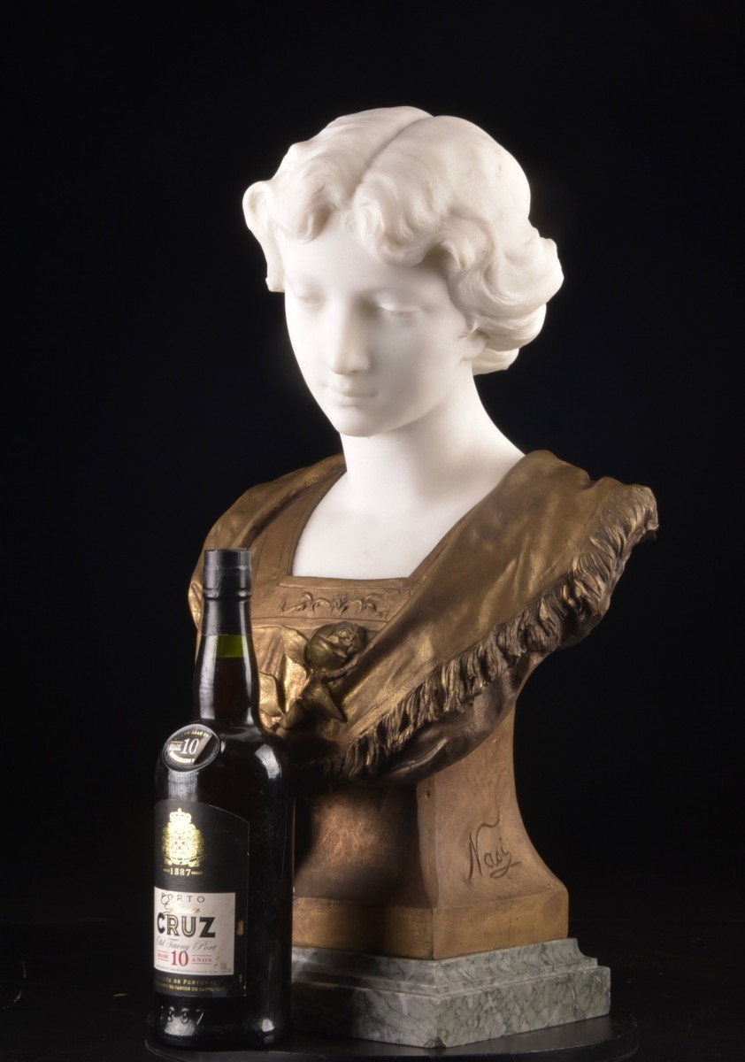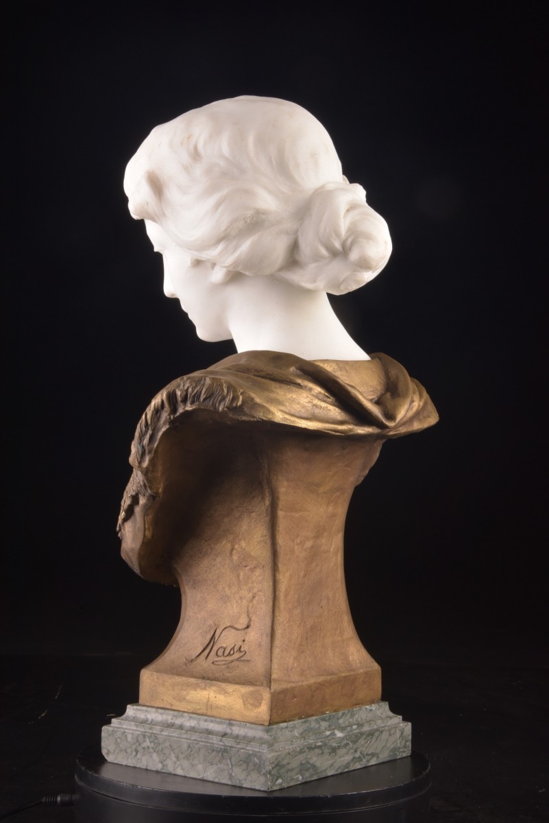 Élégant buste représentant une jeune femme, réalisé en marbre de Carrare et en bronze. La tête, finement sculptée dans un marbre blanc de grande qualité, présente un visage aux traits doux et une expression délicate, avec le regard légèrement baissé. La coiffure, relevée en chignon, est traitée avec beaucoup de finesse et rappelle l’esthétique classique de la sculpture européenne de la fin du XIXe siècle. Le buste et le vêtement sont réalisés en bronze à patine chaude. Le drapé est richement travaillé et orné d’une fleur sur la poitrine ainsi que d’une frange décorative, créant un beau jeu de lumière et de relief. Le contraste entre la pureté du marbre et la chaleur du bronze confère à l’ensemble une présence élégante et décorative. L’œuvre repose sur un socle en marbre veiné vert. Elle est signée Nasi au dos, sculpteur italien actif à la fin du XIX? ou au début du XX? siècle. Dimensions