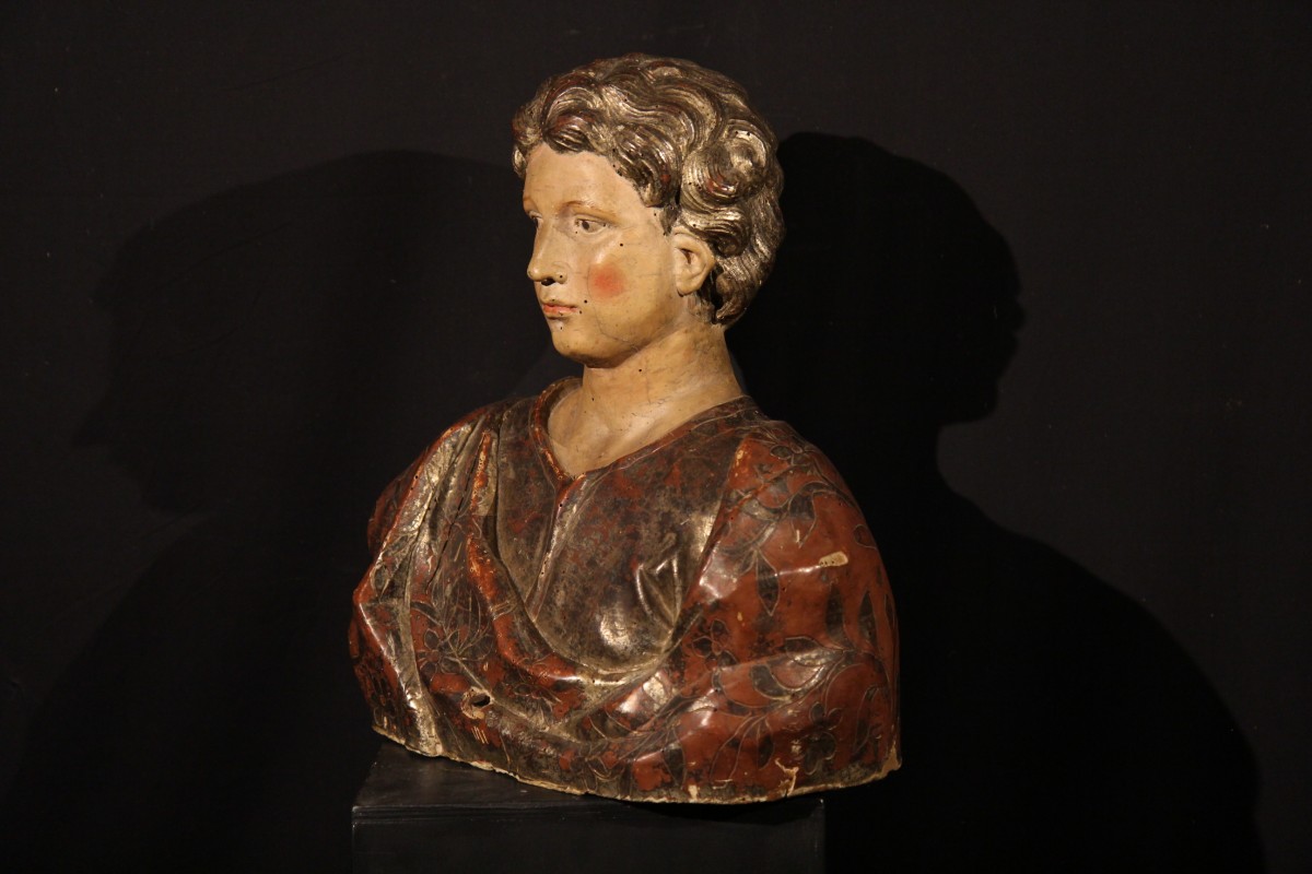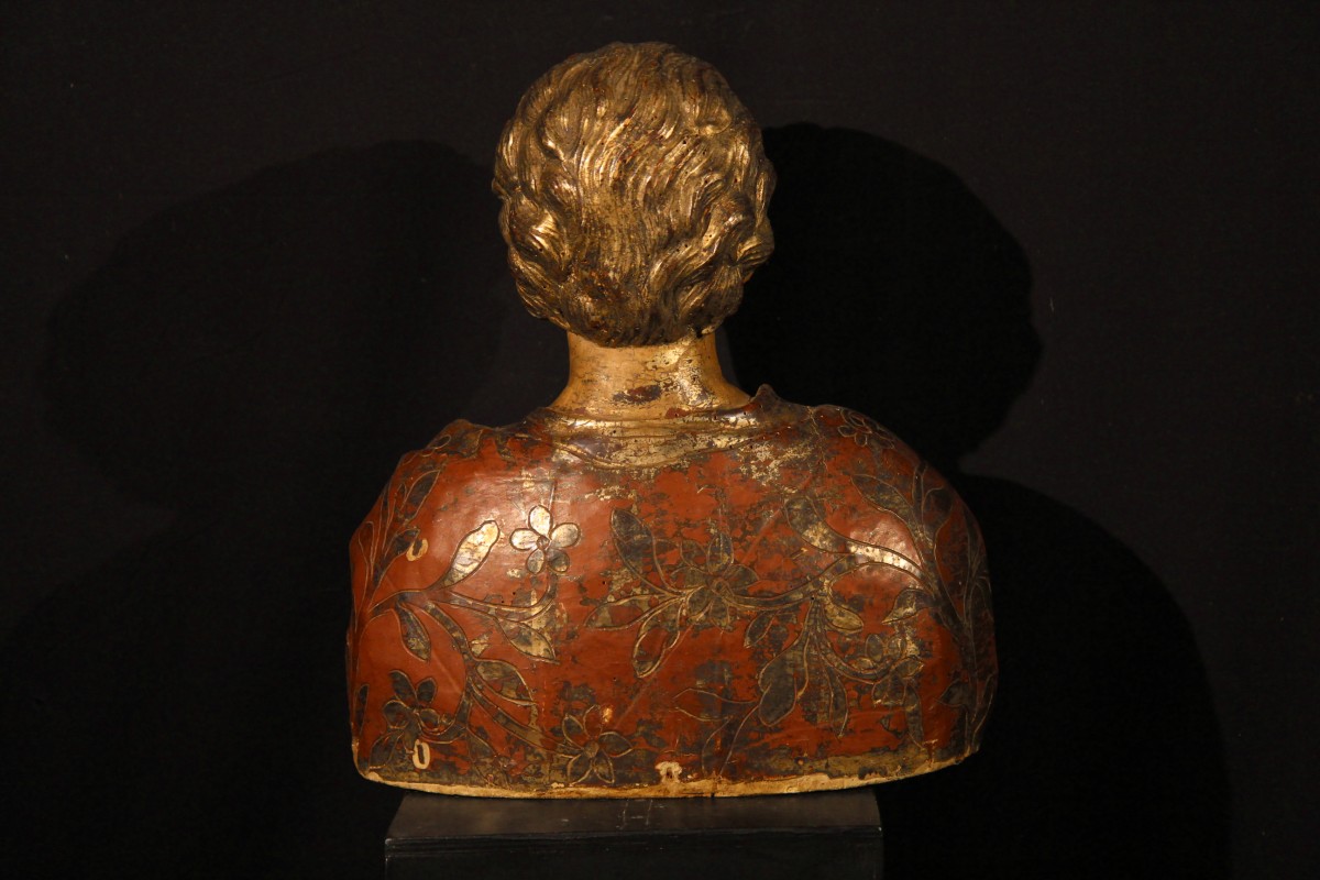 Buste de jeune homme dans le goût de la renaissance italienne en bois sculpté, laqué et doré, avec un riche décor floral de son habit traité en sgraffito.