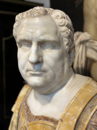 Important buste représentant l’empereur Vitellius en marbre blanc de carrare pour la tête, marbre jaune et rose de sienne pour la chlamyde* et marbre africain pour les épaulettes.