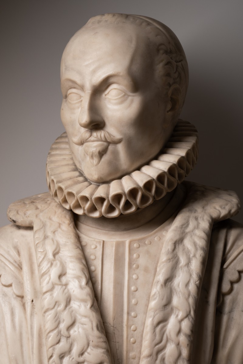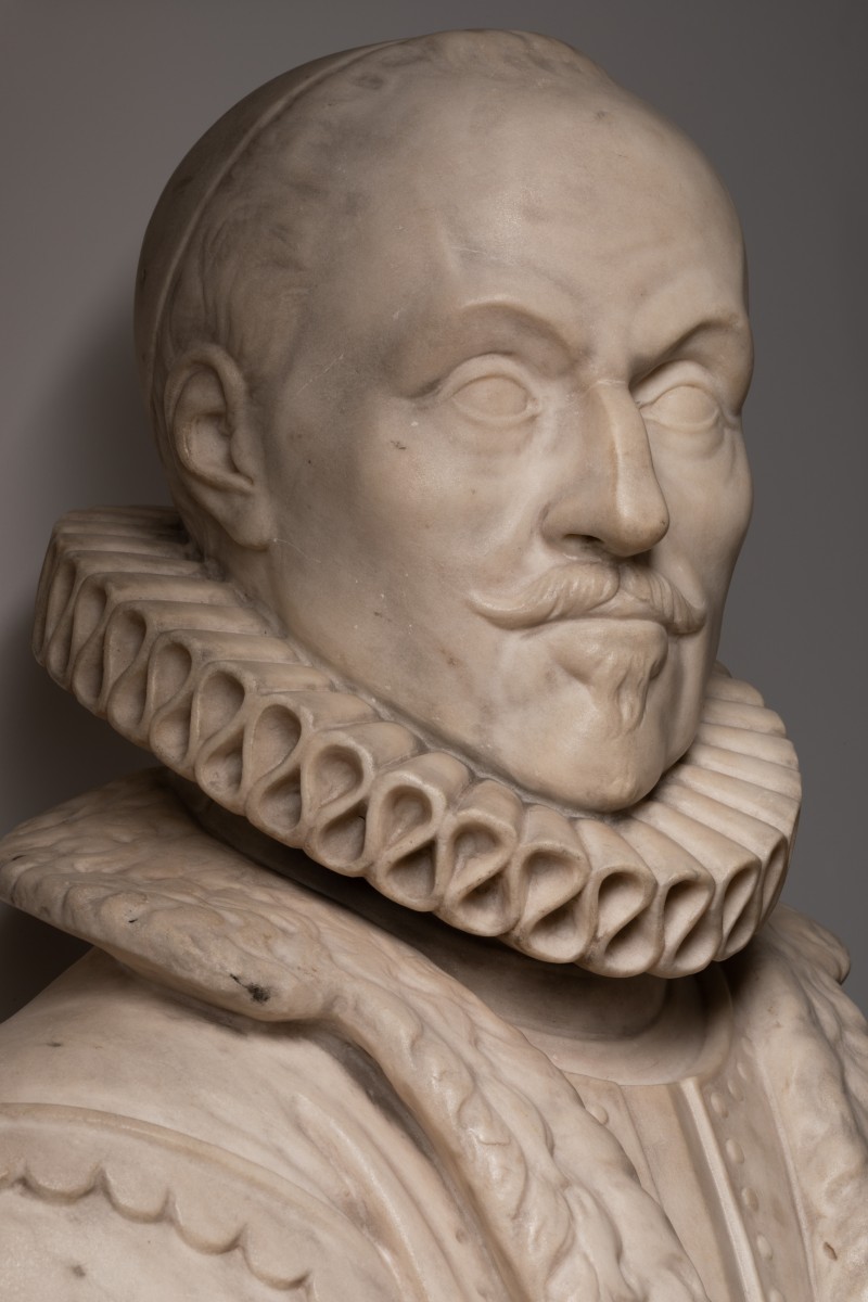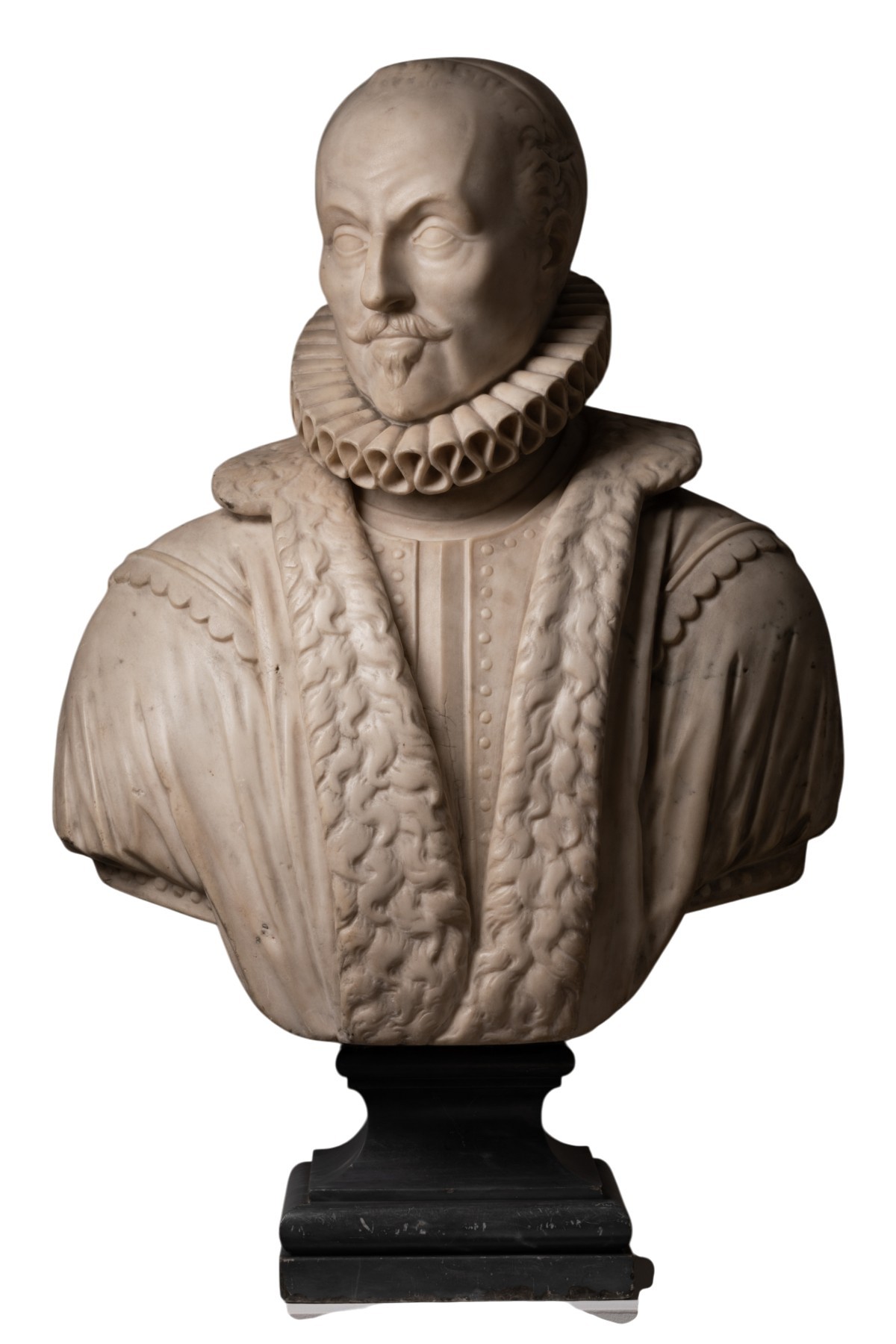 Ce majestueux buste en marbre représente un homme d’âge mûr, vu de face avec la tête légèrement tournée vers la droite. L’homme porte une fraise autour du cou, une armure et un grand col de fourrure qui descend jusqu’en bas du buste. Le visage est grave, sérieux et solennel. L’homme arbore une petite moustache légèrement relevée, une barbichette et porte sur le haut du crâne un petit bonnet. Les différents éléments de ce buste nous laissent à croire qu’il s’agit de la représentation d’un homme important, d’origine noble, à la carrière militaire longue et particulièrement dévot. Après l’étude de plusieurs portraits nous pouvons avancer le nom de Guillaume d’Orange.