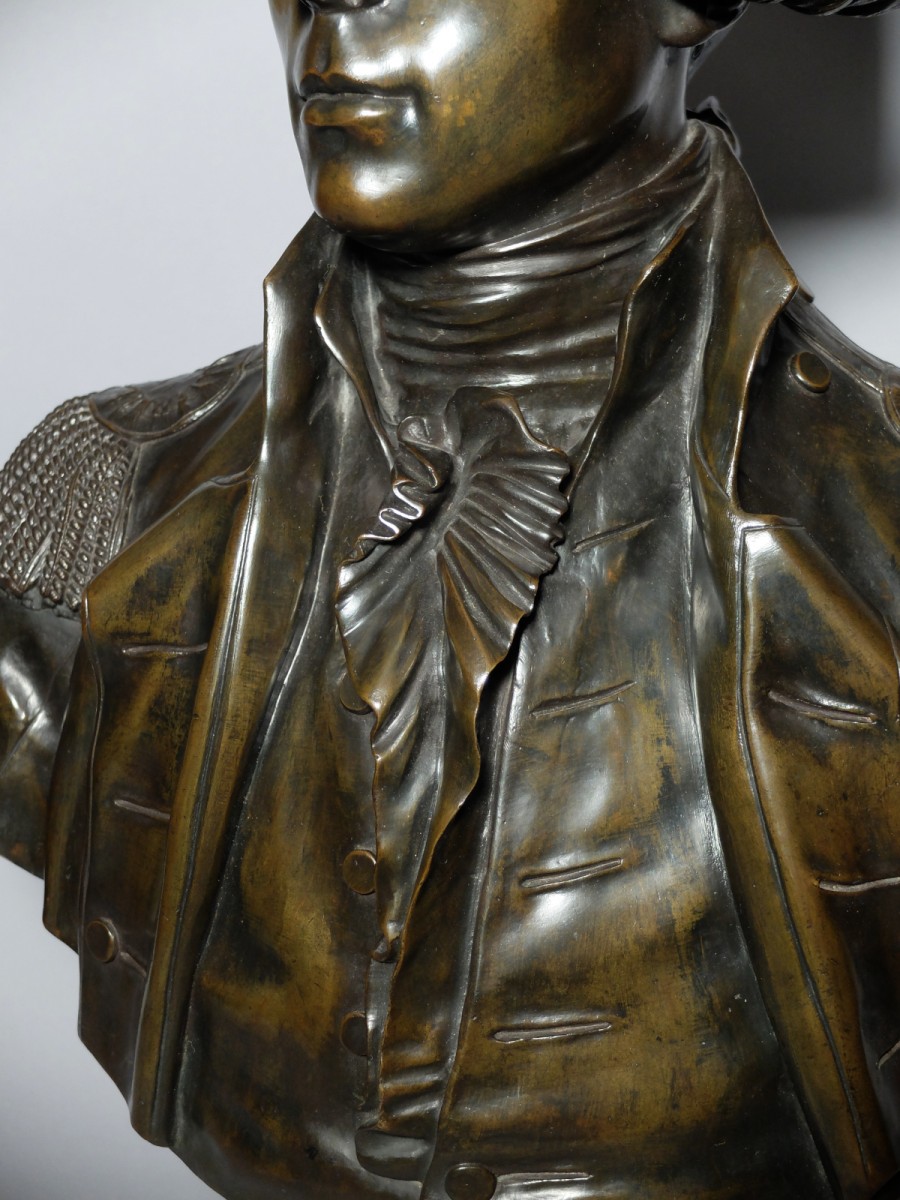 Buste du Marquis de La Fayette en bronze patiné, reposant sur un socle en piédouche en marbre blanc (postérieur).