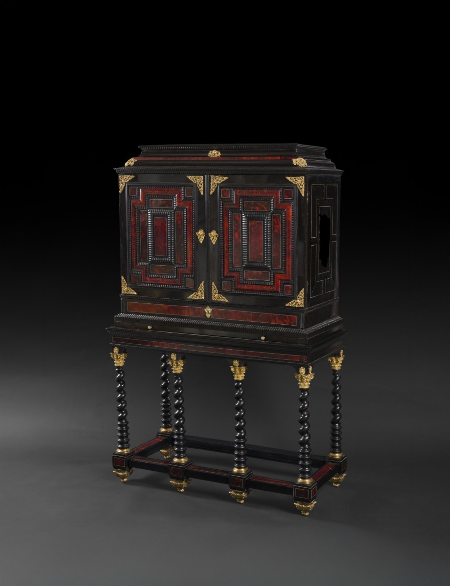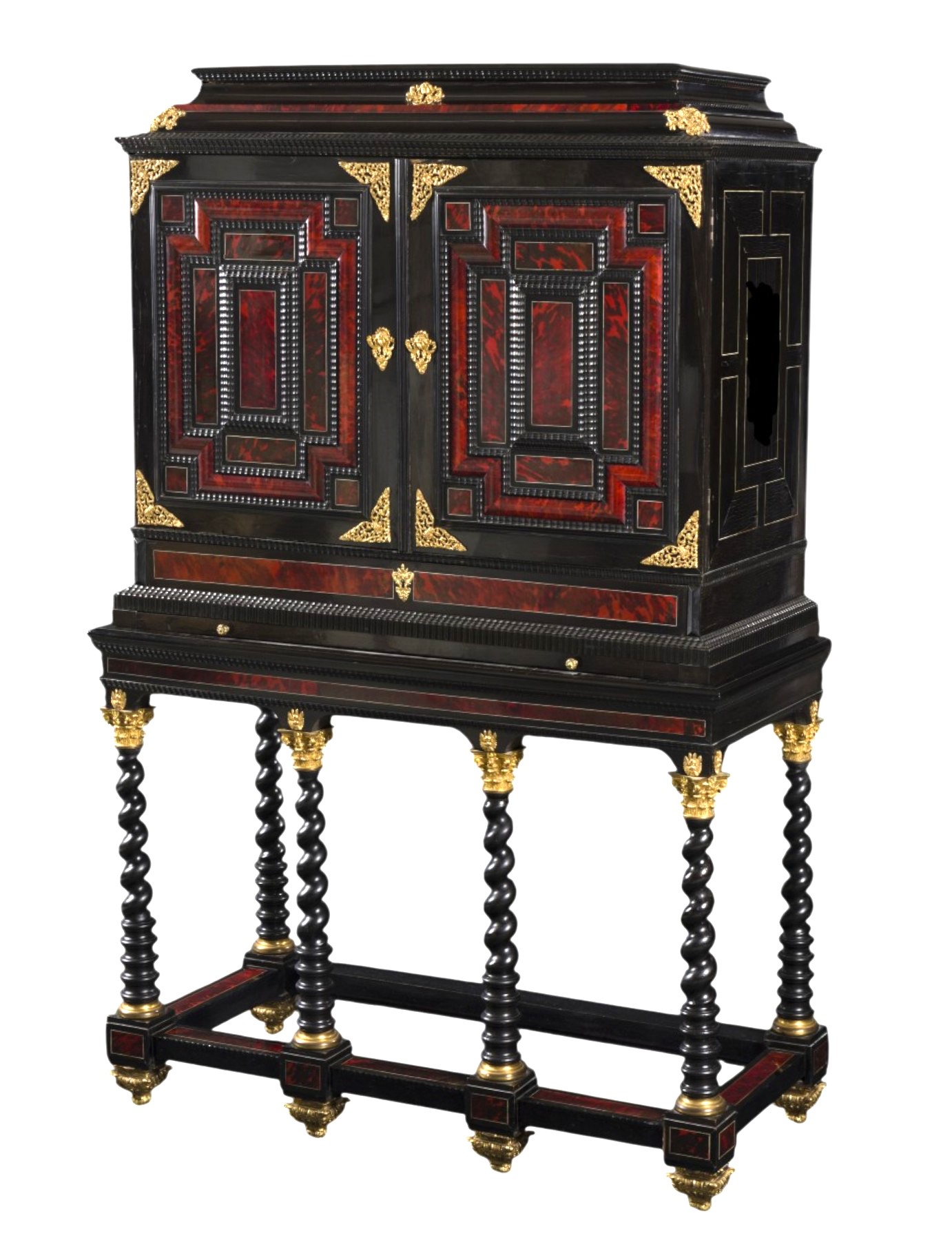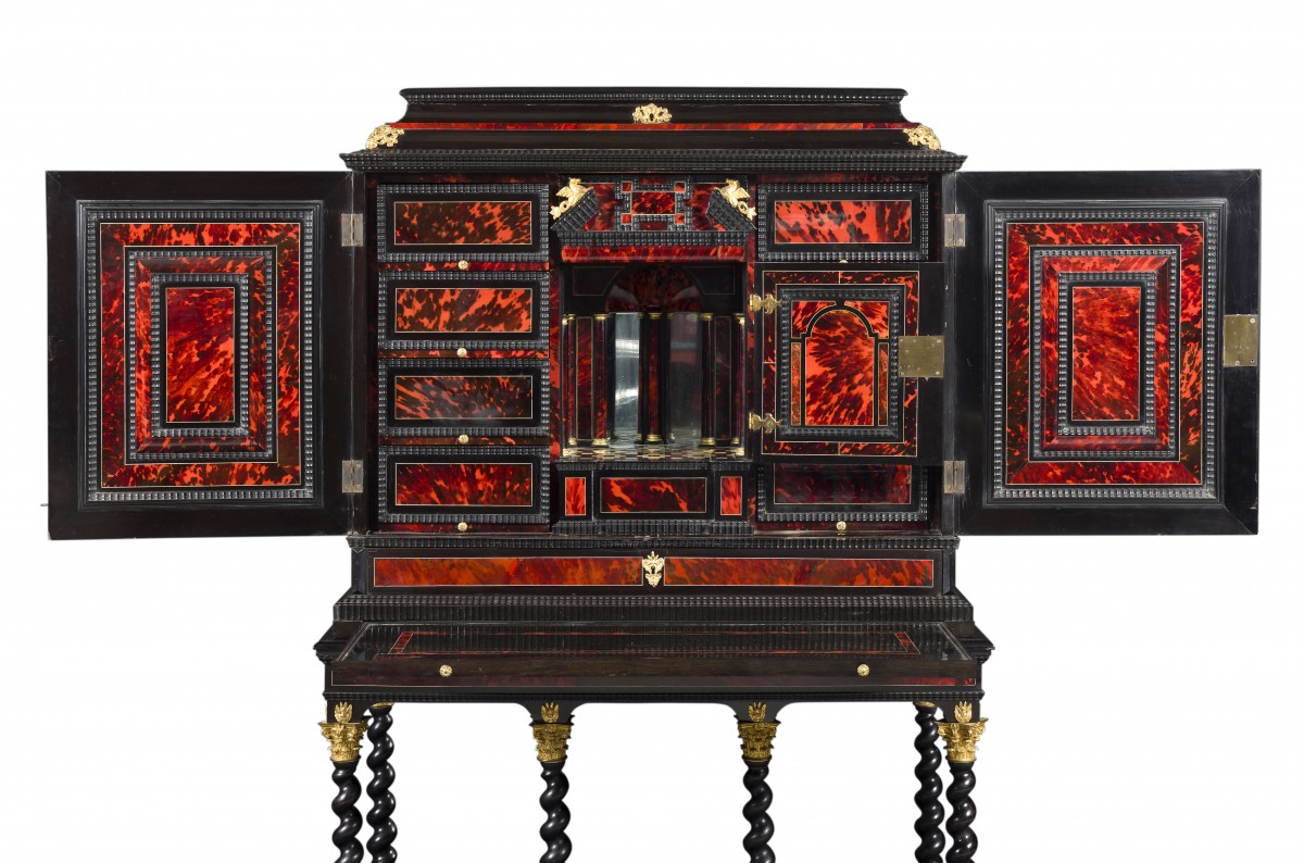 Cabinet en écaille et ébène, à décor d'encadrements en relief à bordures ondées, ouvrant à deux tiroirs et deux vantaux découvrant dix tiroirs et un guichet contenant un théâtre à parquet de placage d'ivoire, écaille et miroirs, reposant sur un piétement à pied et chapiteaux.