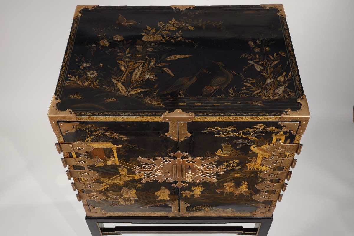 Cabinet Edo en bois laqué noir du japon à décor japonisant de paysages lacustres, architecturés, pagodes et scènes de chasse.