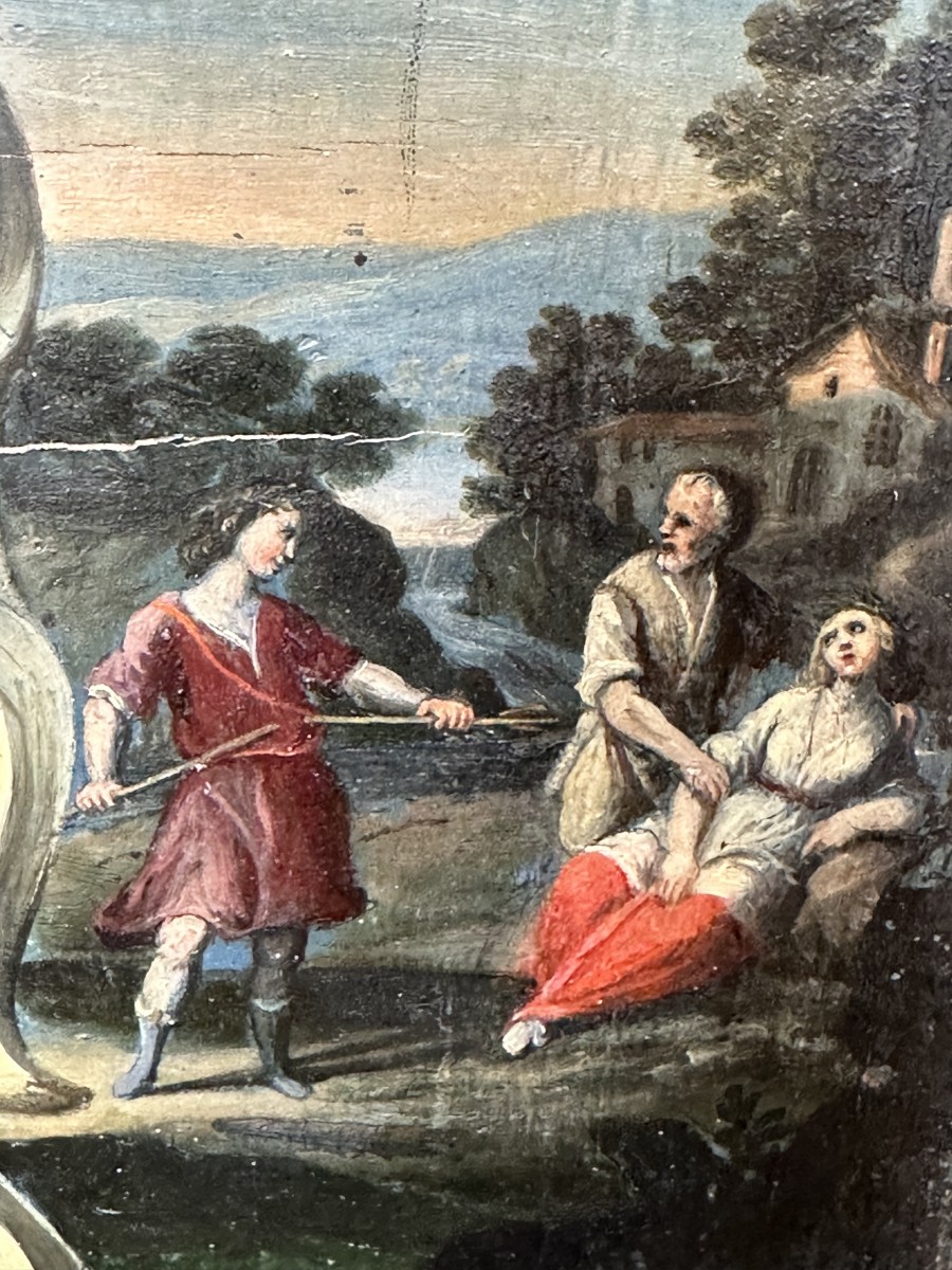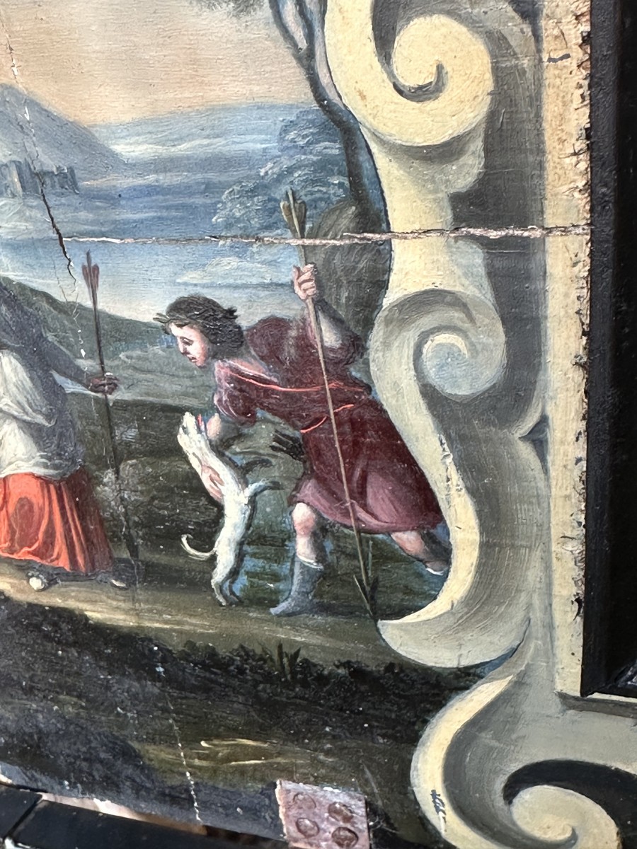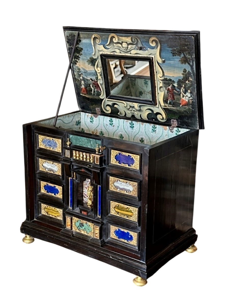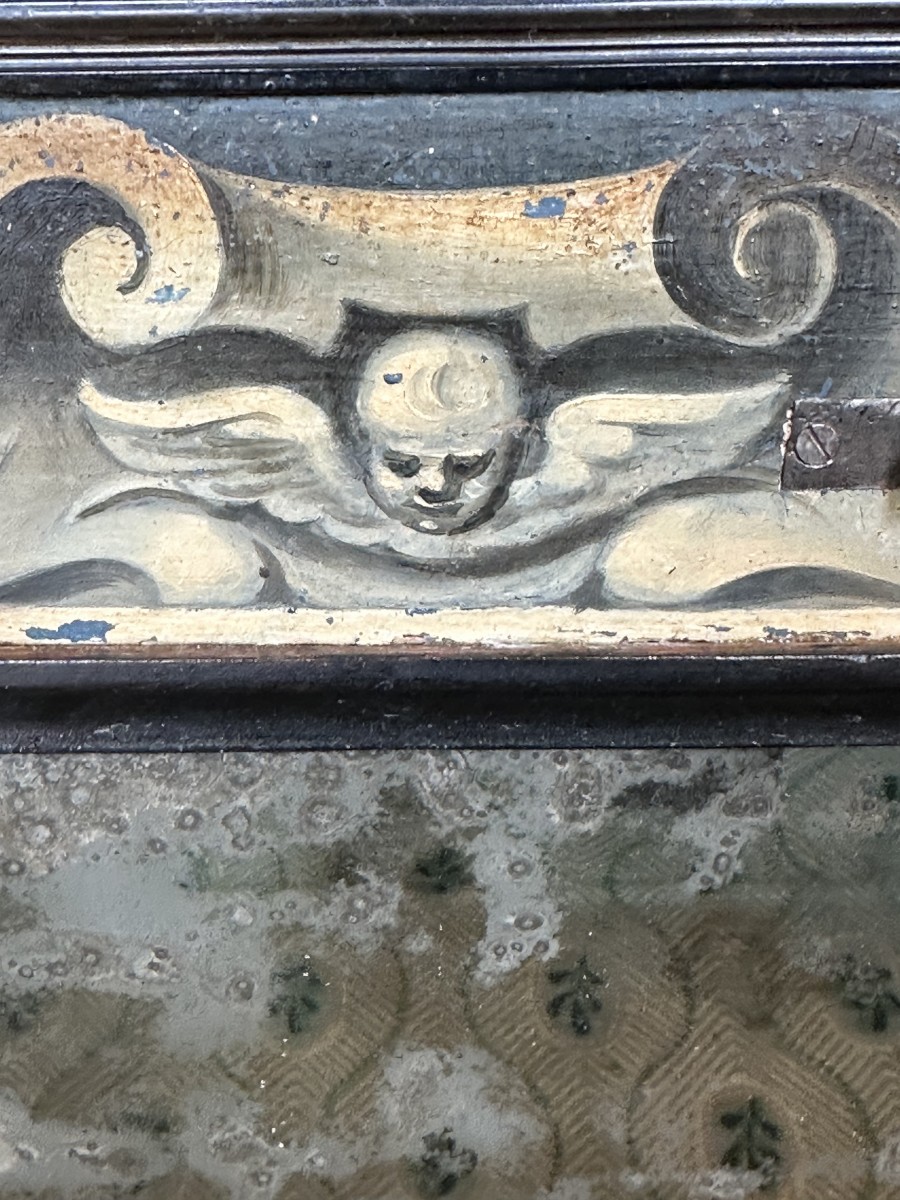 Petit cabinet florentin, ouvrant sur le dessus et laissant découvrir un miroir central sur un fond en peinture d'une grande finesse.