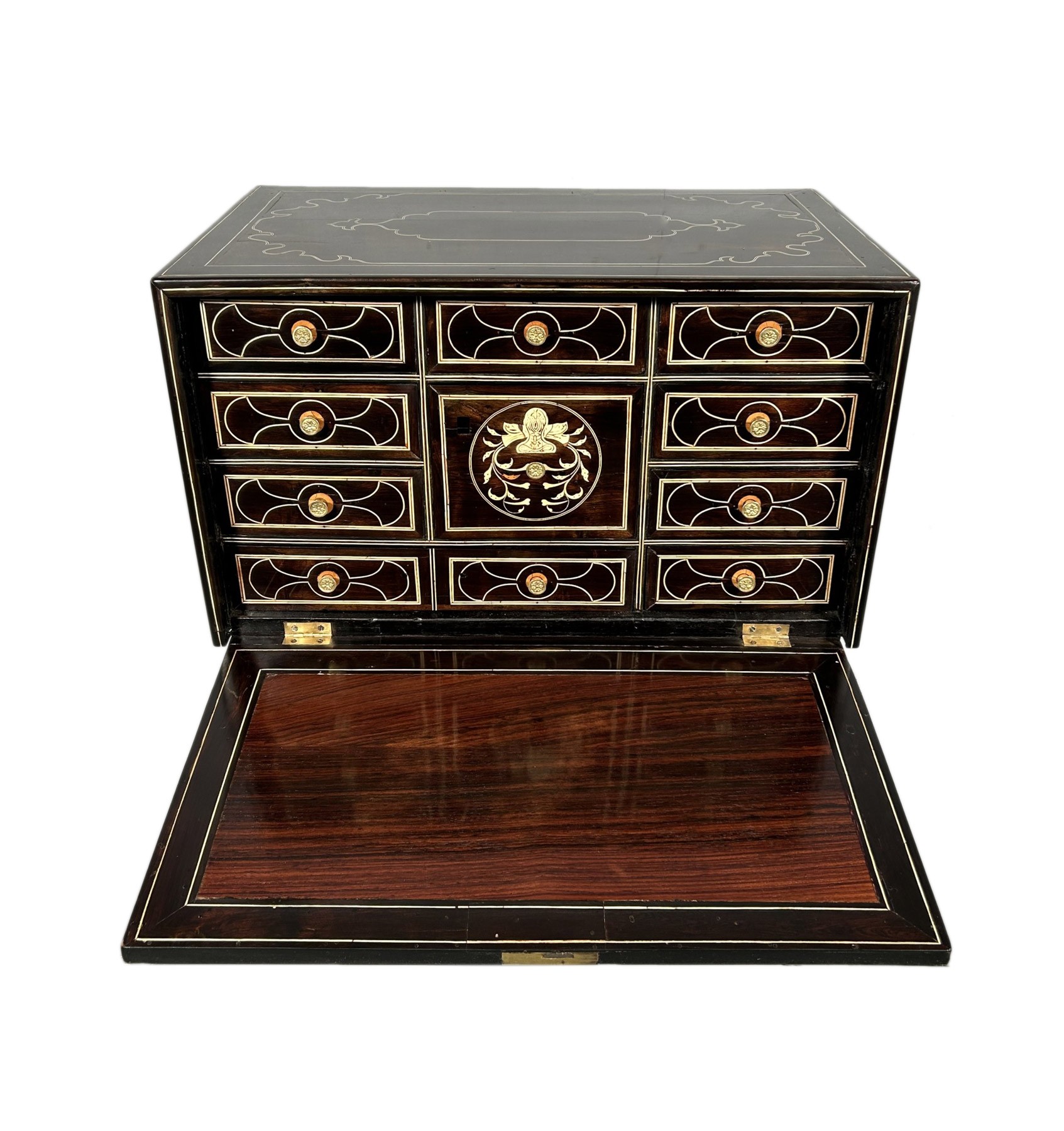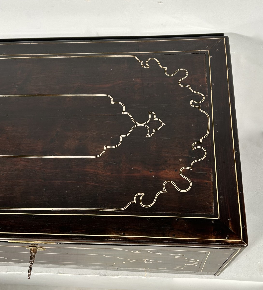 Important et précieux cabinet en placage de bois « sisso d’Albergia » incrusté de filets d’ivoire sur toutes ses faces.