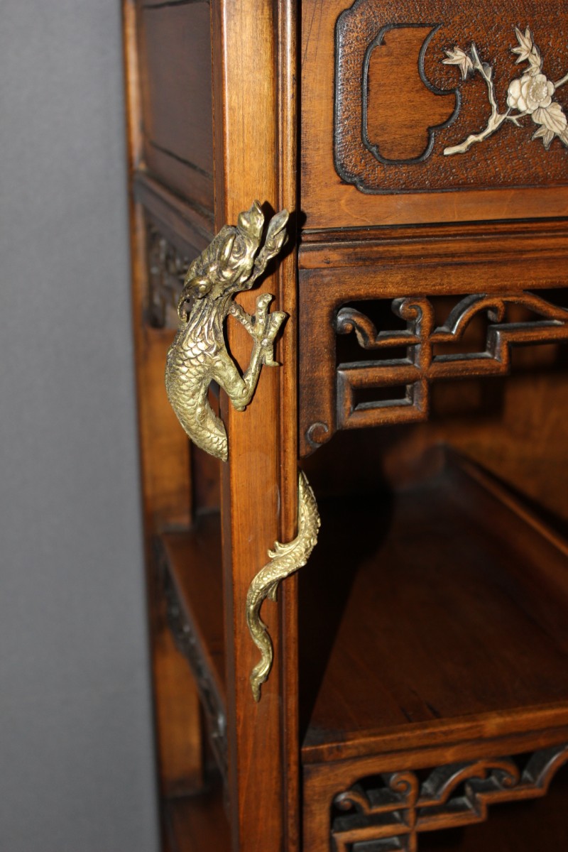 Cabinet dans le goût du Japon en cerisier , os et nacre , décor de fleurs et d'un personnage , dragon en bronze remontant le long du montant gauche , il ouvre par un tiroir et une porte , signé A. Bastet à Lyon , ensemble en très bon état
