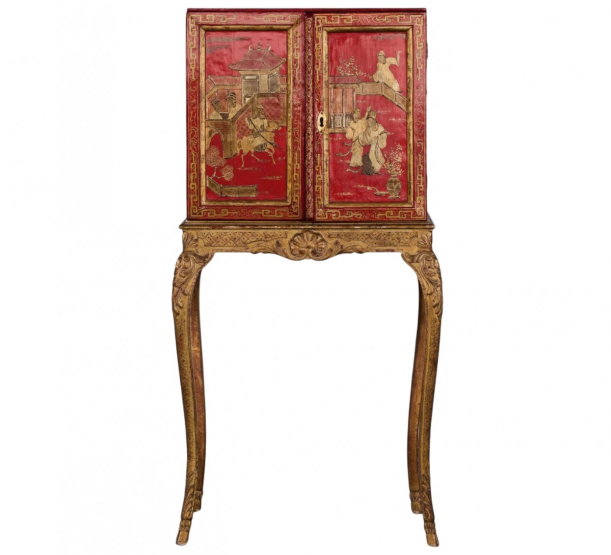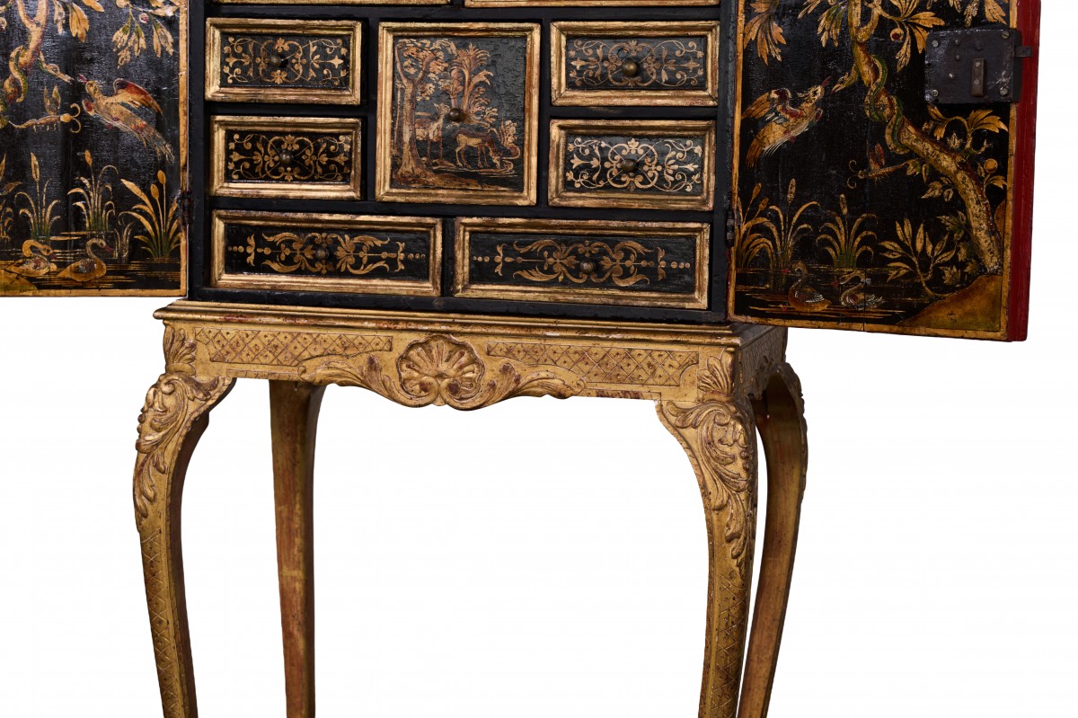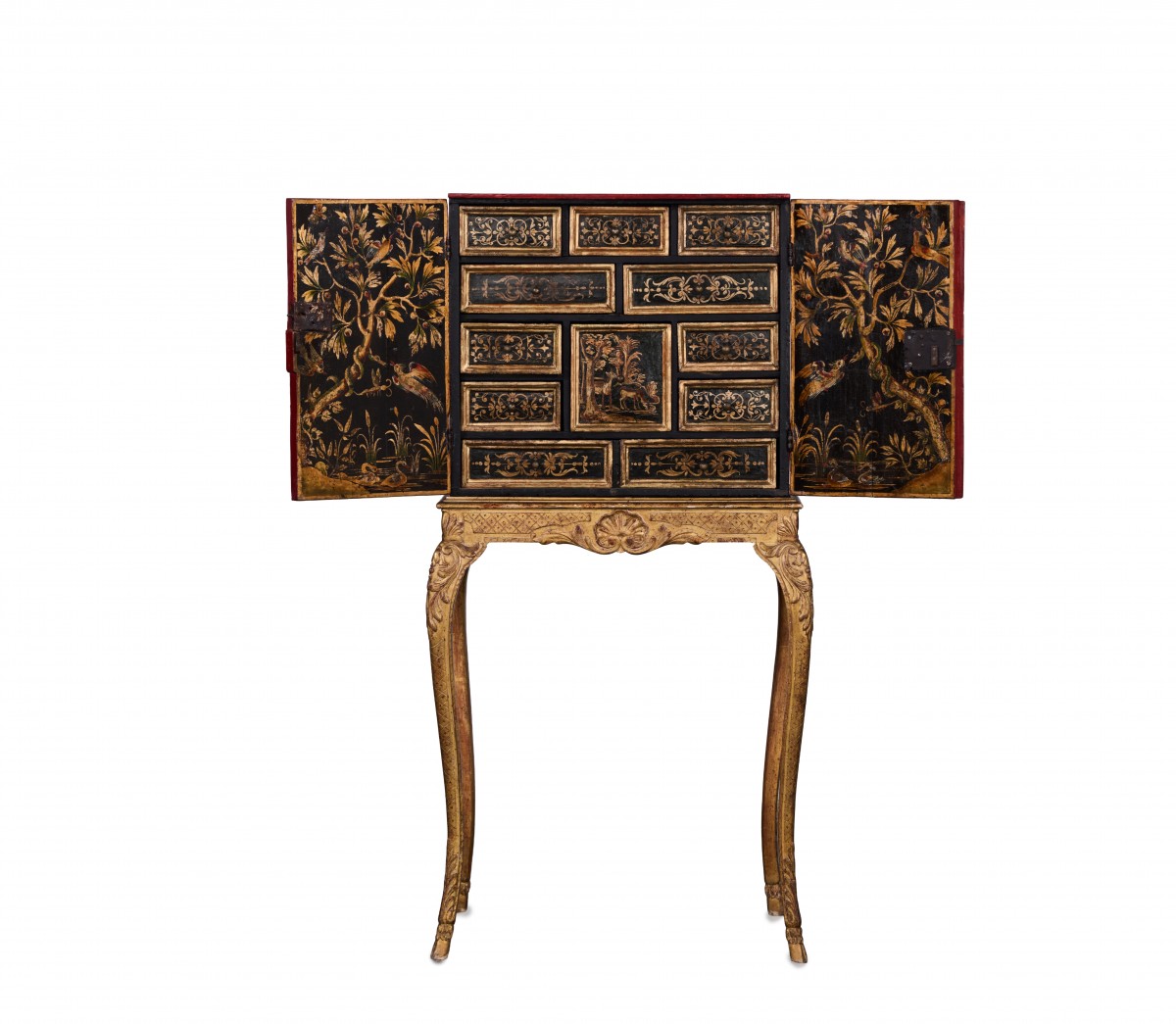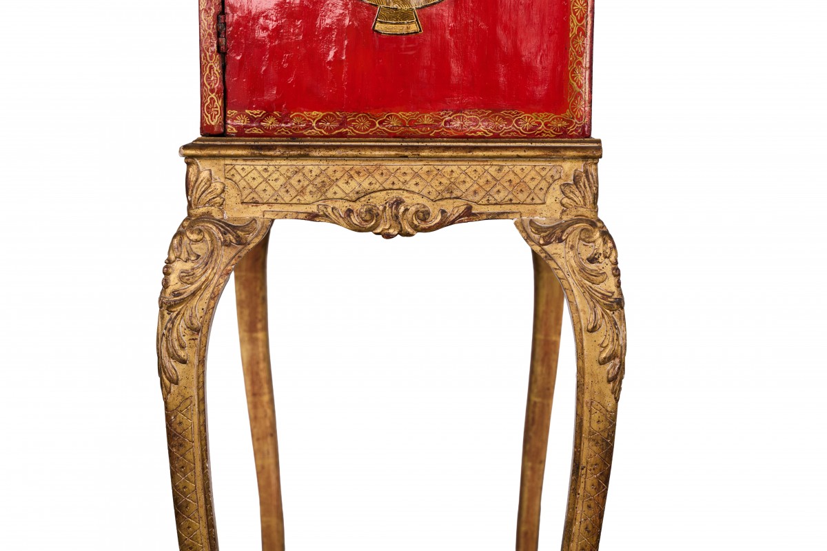 Le cabinet repose sur un piètement en bois sculpté et doré de style Régence, réalisé postérieurement. Ce piètement adapté à la taille et au style du cabinet, magnifie la pièce en lui donnant hauteur et présence, selon l’usage courant dans les intérieurs aristocratiques du XVIIIe siècle et du XIXe ...