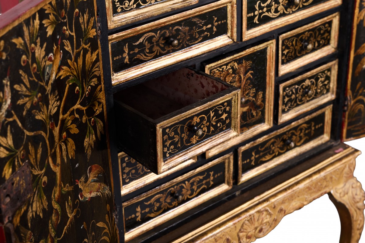 La façade ouvre par deux portes révélant un intérieur à douze compartiments et tiroirs, également décorés de feuillages stylisés et d'oiseaux dorés sur fond noir.