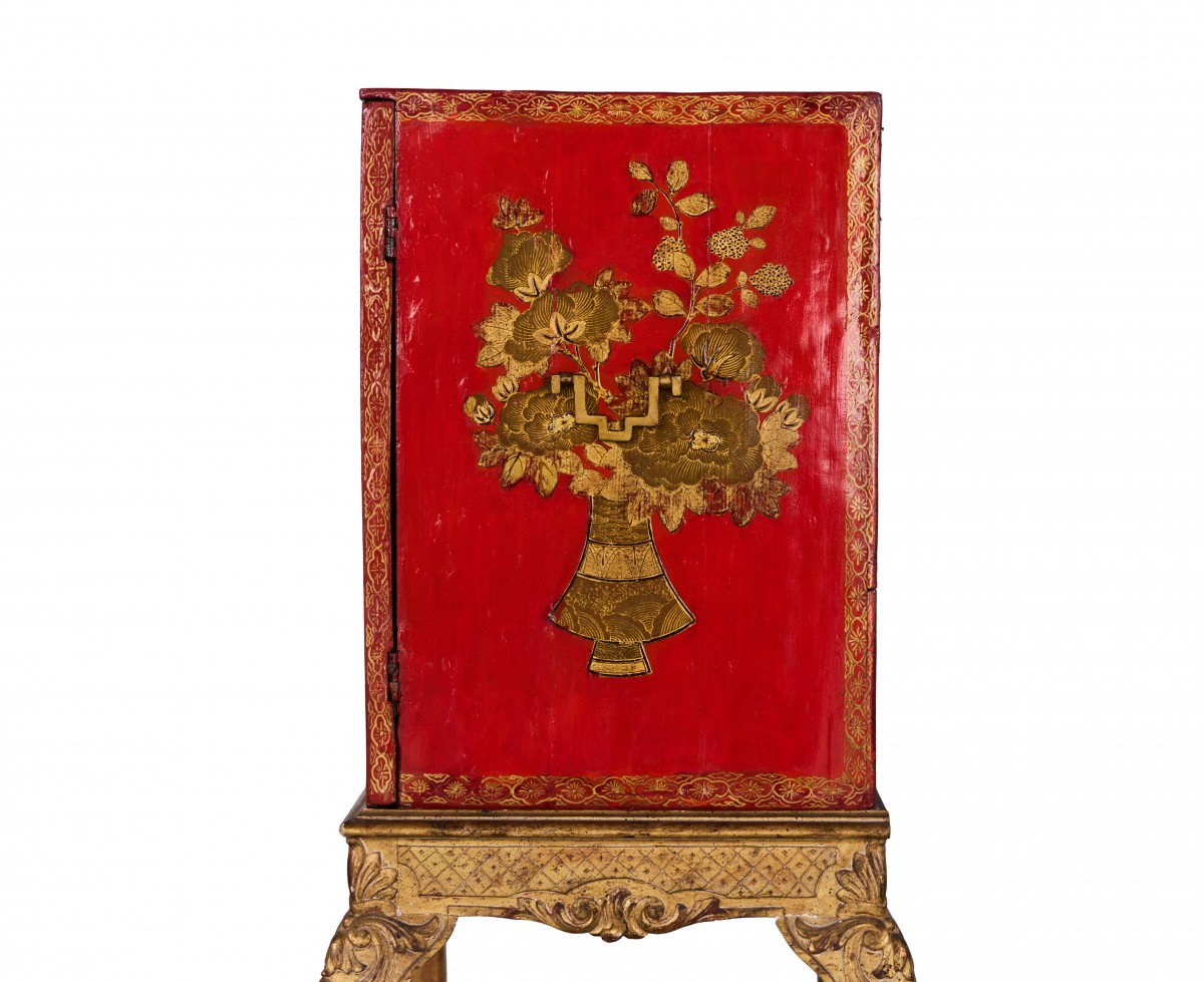 Élégant cabinet rectangulaire en laque de Chine du XVIIIe siècle, décoré de scènes polychromes à l’or fin sur fond rouge, représentant des pavillons animés par des personnages et une végétation stylisée. La surface du meuble est finement animée de détails minutieux : Architectures orientales et personnages élégants dont des cavaliers.