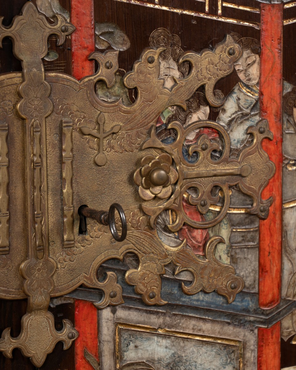 Outre l’abondance du décor et la richesse du piètement en bois doré, la plus grande qualité de notre cabinet provient de la qualité de son décor de laque qui est profondément incisé et finement gravé et ou les couleurs originellement chatoyantes ont peu à peu laisser places à de douces tonalités pastels aux charmes inimitables.