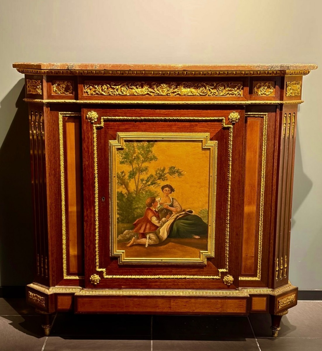 Le panneau central est décoré d’une scène pastorale peinte, encadrée par une élégante bordure dorée qui constitue le point focal de la composition. Les côtés sont ornés d’appliques verticales en bronze doré et de cannelures décoratives, accentuant la symétrie classique et les proportions harmonieuses du meuble.
