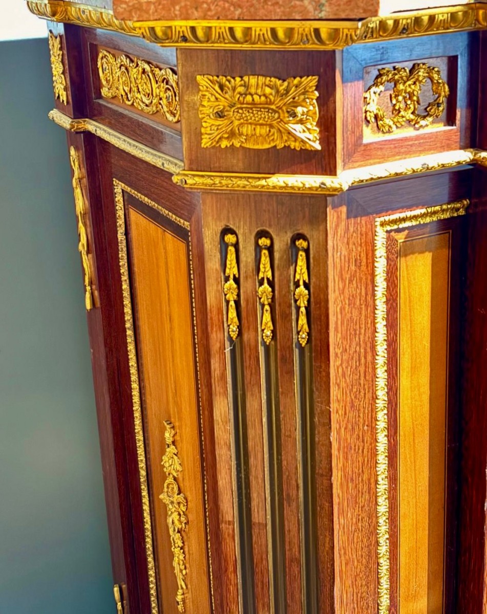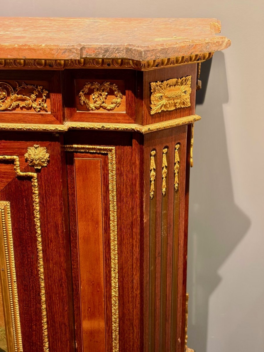... marbre brèche, dont les tons chaleureux s’harmonisent parfaitement avec la richesse du placage d’acajou et l’éclat des bronzes dorés. L’ensemble témoigne du haut niveau de savoir-faire caractéristique des meilleurs ateliers parisiens du milieu du XIX? siècle.