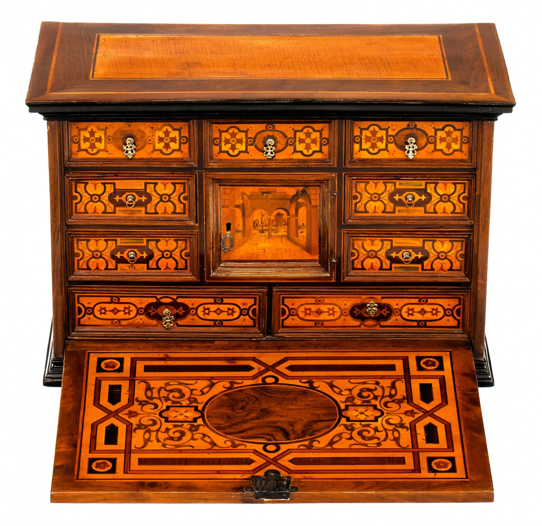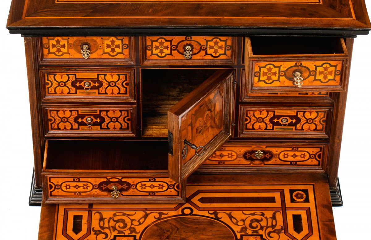 Magnifique cabinet à monnaies Louis XIV, doté d'une façade abattante et d'un riche intérieur de tiroirs agencés autour d'une petite porte centrale.