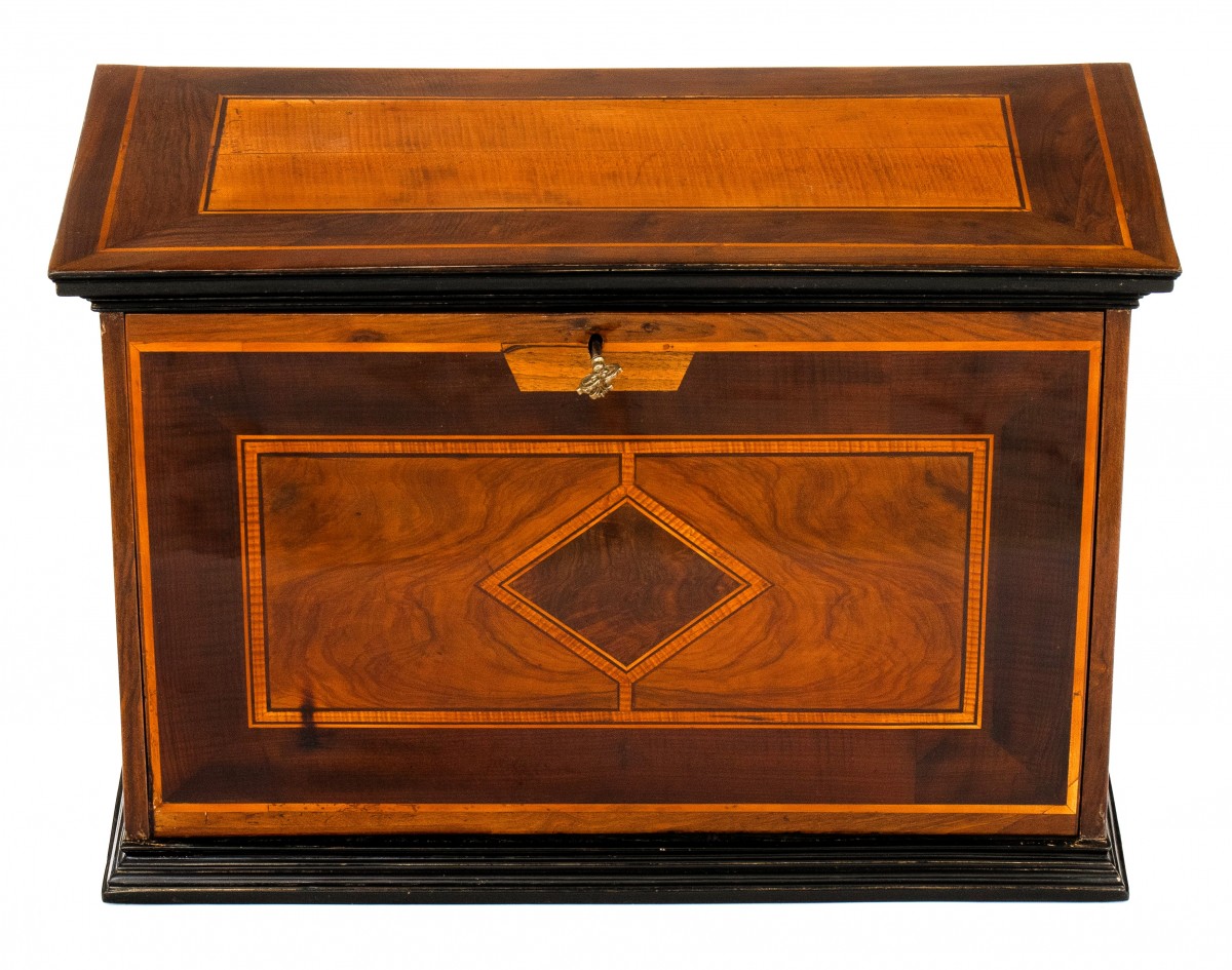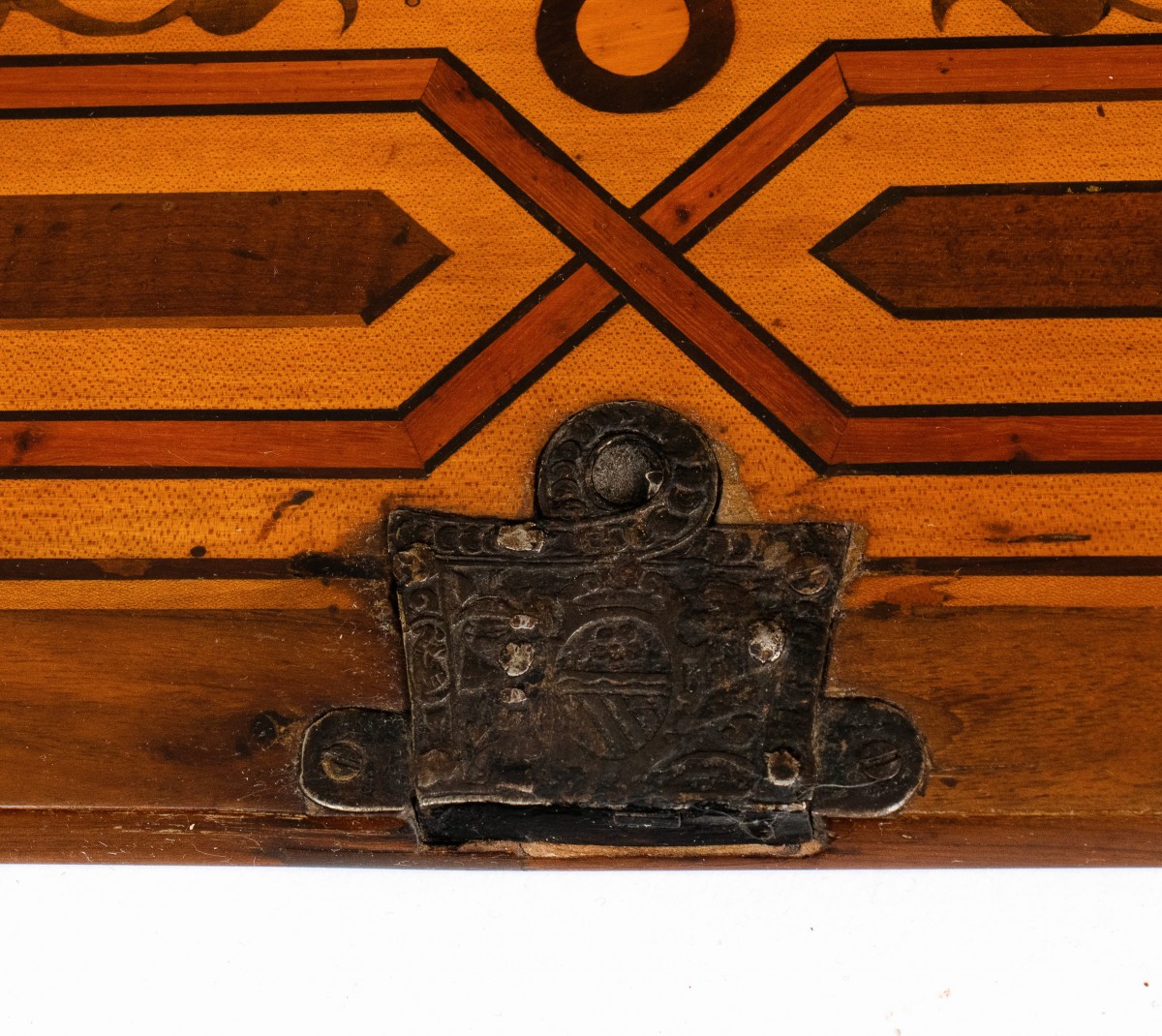Entièrement incrusté de bois précieux, il présente de délicats décors géométriques aux teintes claires et foncées.