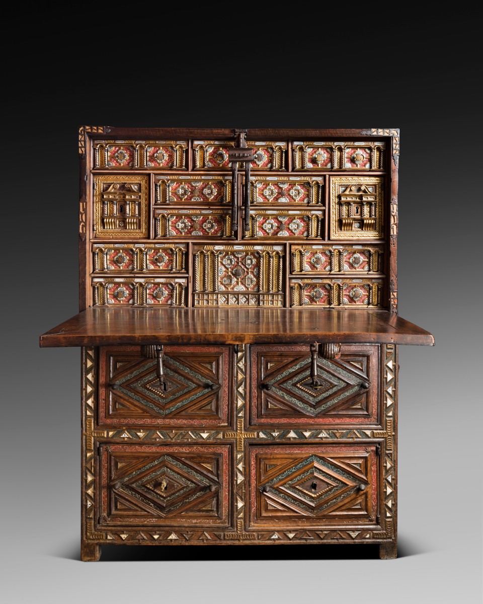 Ce cabinet devenu aujourd’hui très rare est un meuble bien caractéristique de l’art espagnol et n’a été développé dans aucun autre pays. Objet de convoitise, il était à la fois meuble d’apparat que l’on tenait ouvert dans les salles fastueuses du palais, ou coffre de voyage comme l’attestent les poignets latéraux et l’imposante serrurerie.