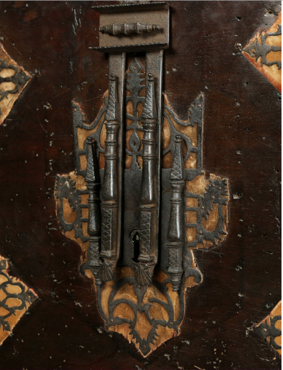 ... côtés de belles ferrures ajourées en fer forgé, sur fond de velours de soie rouge. Ses panneaux sont montés à queue d’aronde et sa façade à emboîtures latérales est fermée par une serrure à double moraillon. Des poignées en fer forgé latérales ornent le bargueno.