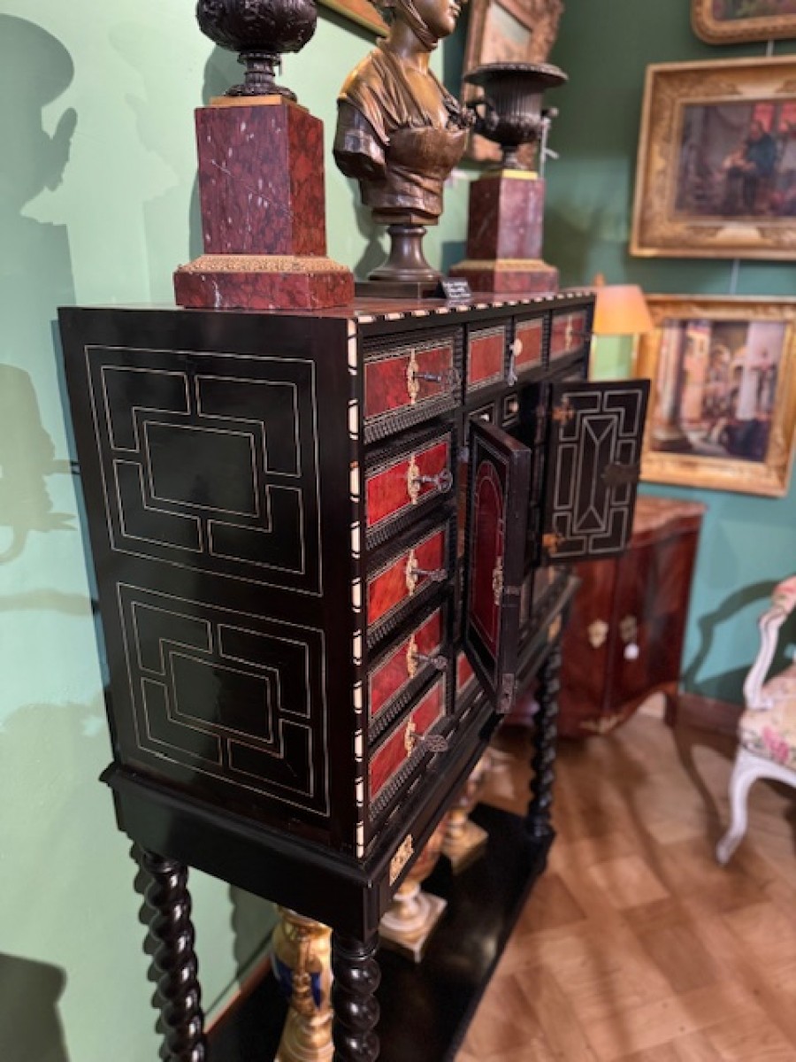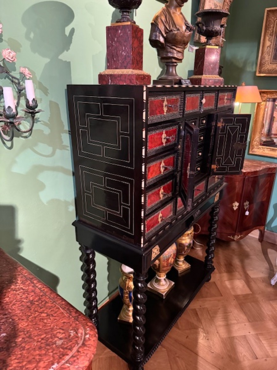 Cabinet 17ème en ébène, écaille de tortue rouge, filets composés, marqueterie comportent 12 tiroirs exterieur et 6 tiroirs interieur la niche centrale comporte du cuir de cordoue 19ème .
