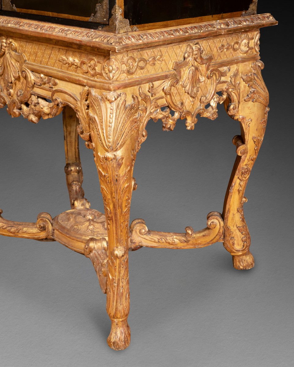 Les pieds galbés se terminent par des sabots de cervidés, reliés par une entretoise mouvementée ornée d’enroulements et de rinceaux.