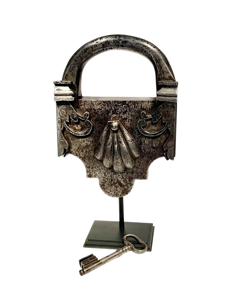 Très beau cadenas italien en fer du XVIIIe siècle, avec sa clé d'origine.