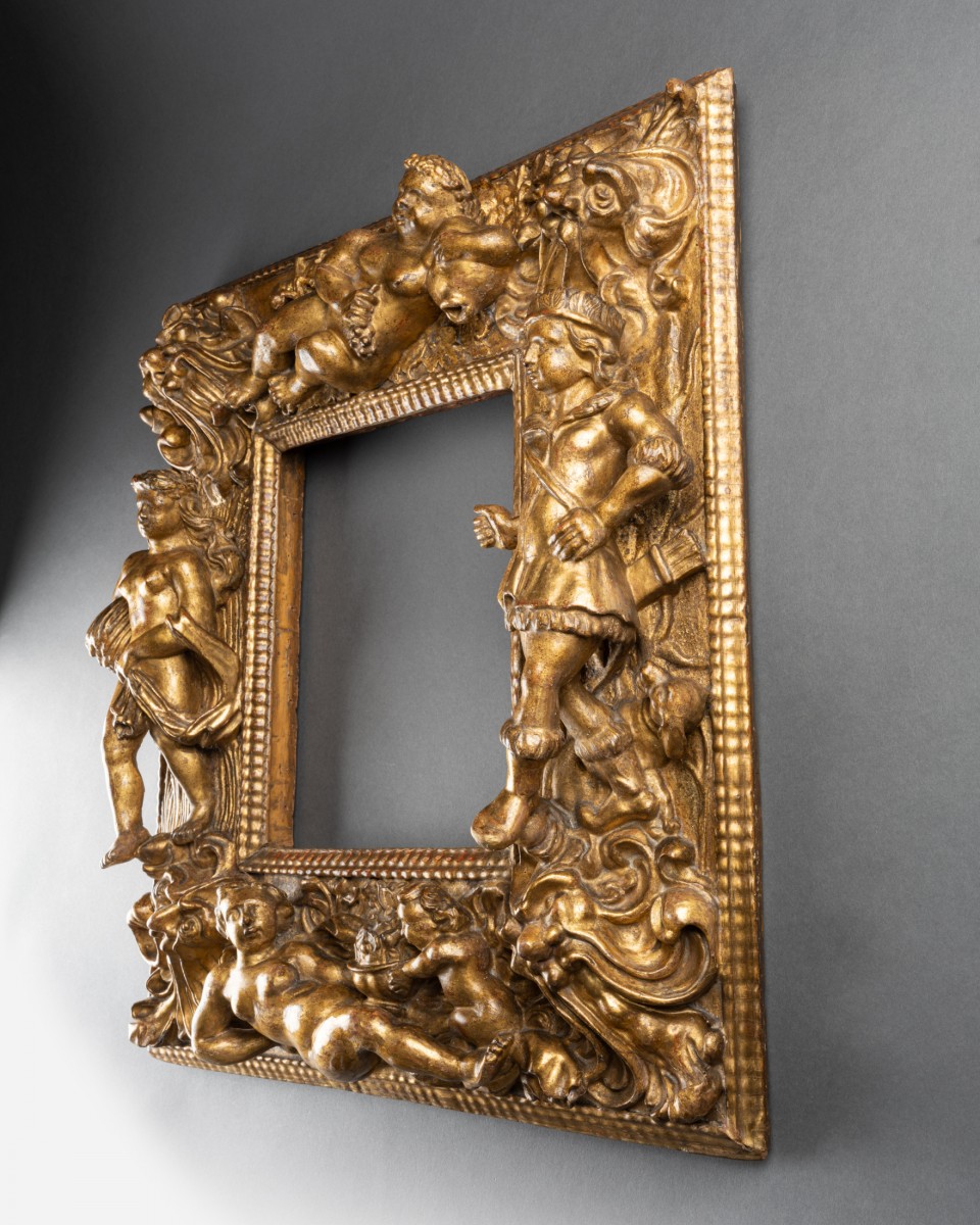 Cet exceptionnel cadre en bois doré est une oeuvre de la fin XVIe siècle. Ses figures sont sculptées en haut-relief dans la masse et représentent les quatre saisons.