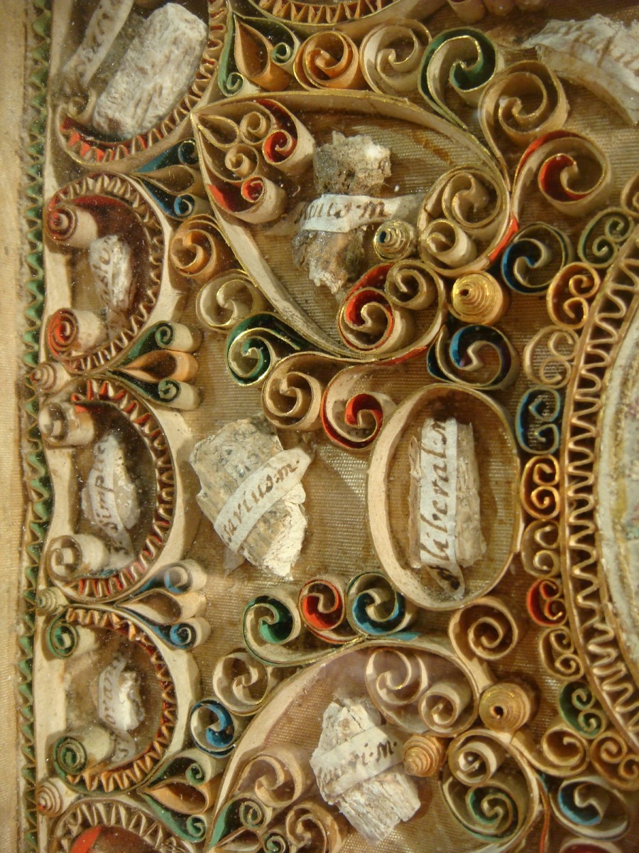 Cadre reliquaire Paperolles avec en son centre un médaillon de stuc en relief rehaussé de couleur et Or , à décor de l’Ange Gabriel agrémenté en pourtour d’une guirlande de fleurs . Ce reliquaire comporte 30 morceaux d’os tel que Saint Vincent , Saint Clément , Saint Maxime , Saint Hanibalis , etc …. ces paperolles sont présentées sous un verre ancien , dans un cadre en bois sculpté et doré , monté à clavettes .Présence d’une étiquette de Don sur l’arrière . Présence d’un morceau d’os décollé , un autre manquant et un petit éclat du verre en bas à droite .