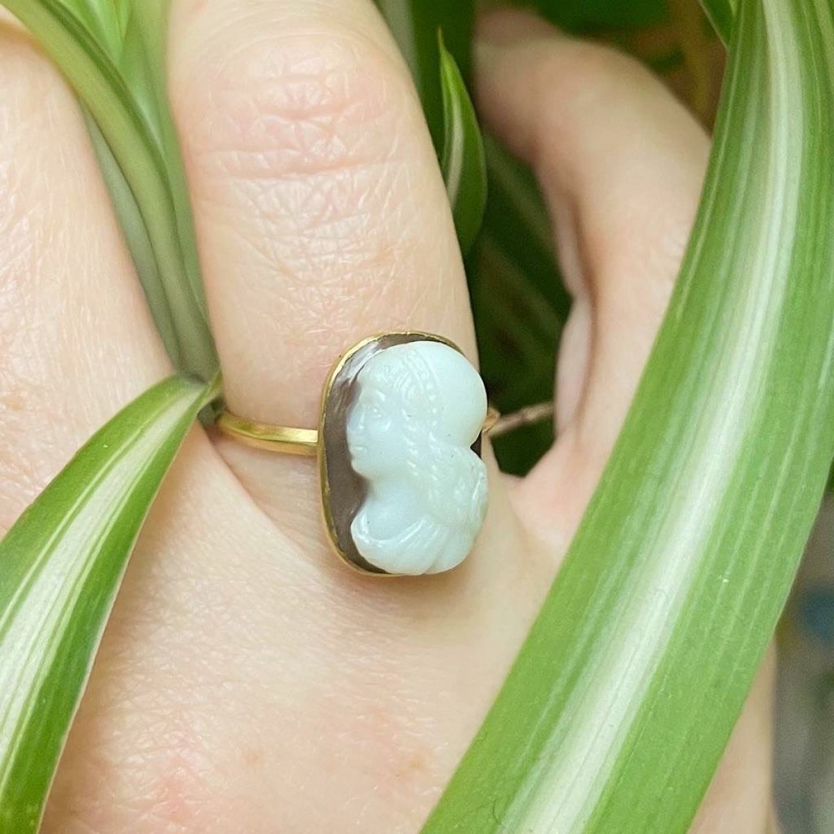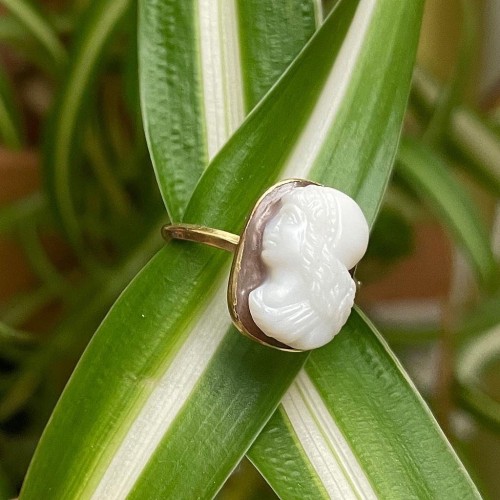 Un camée en sardonyx d'une femme noble monté dans une bague en or à haut carat.