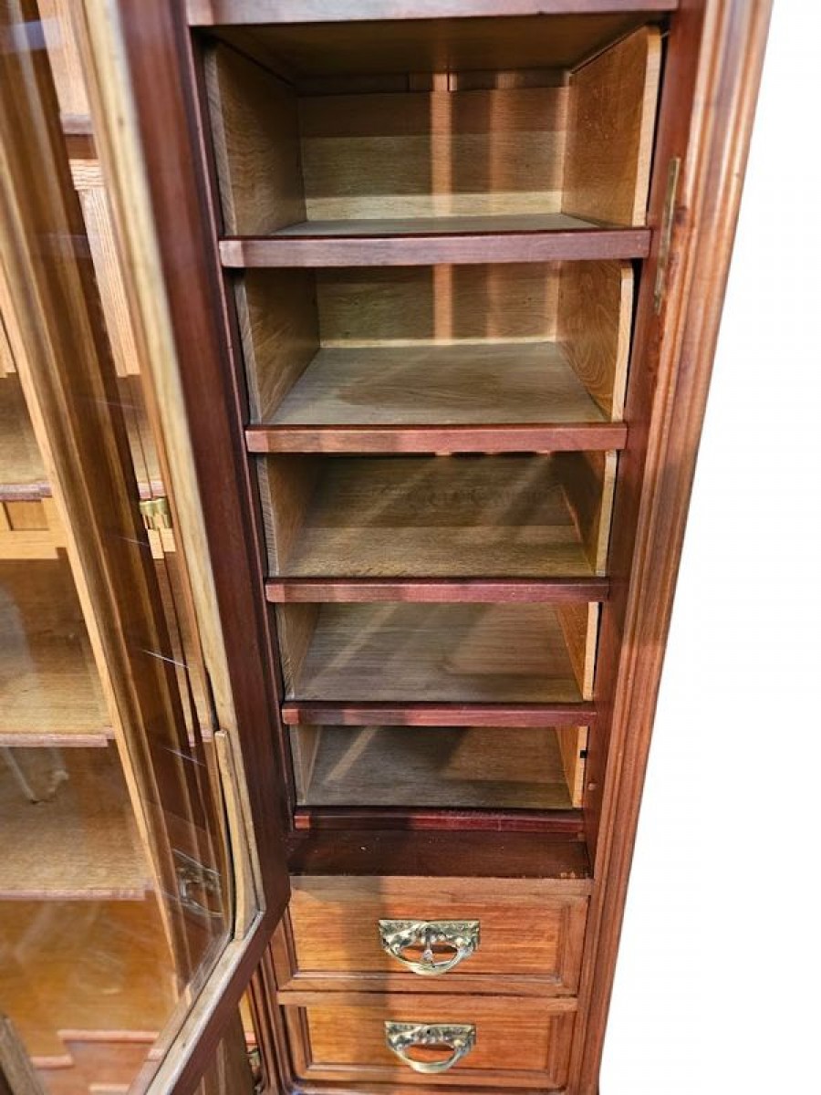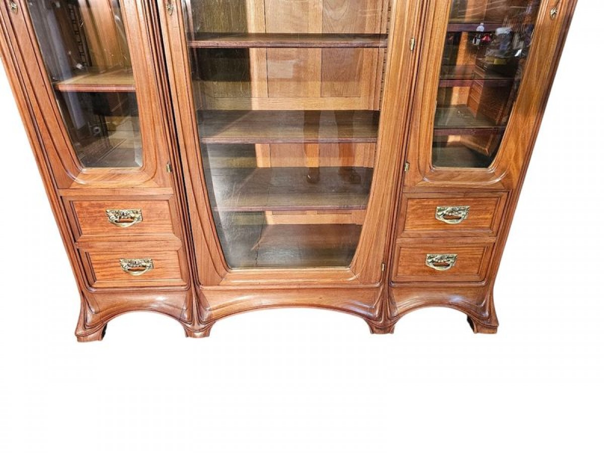 Importante bibliothèque en acajou massif et placage d'acajou satiné, moulurée et sculptée à décor de feuilles et d'akènes de platane. Elle ouvre par trois portes vitrées et quatre tiroirs, les cotés sont galbés sur toutes la hauteur, la corniche à découpes chantournées est nervurée et sculptée en haut relief de feuillages et de fruits, elle repose sur six pieds moulurés et présente des traverses basses à découpes arrondies. Les tiroirs et les portes présentent d'importantes poignées en bronze doré, les vitres sont biseautées, les rayonnages modulables en hauteur, la partie droite est équipée de tablette coulissantes. Parfait état et très belle finition patinée!