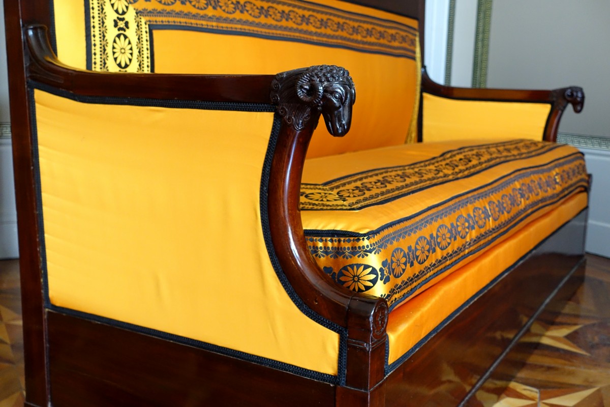 Notre banquette est une production de luxe, un modèle très probablement unique et l'objet d'une commande spéciale pour une famille (Général Maransin) ou un palais prestigieux sous le consulat ou le début de l'Empire. La qualité de sculpture des têtes de béliers est admirable : tête fine où l'on distingue le veinage sous la peau, poils frisés, cornes et oreilles pointues.
