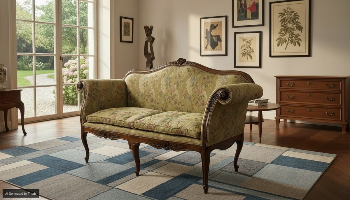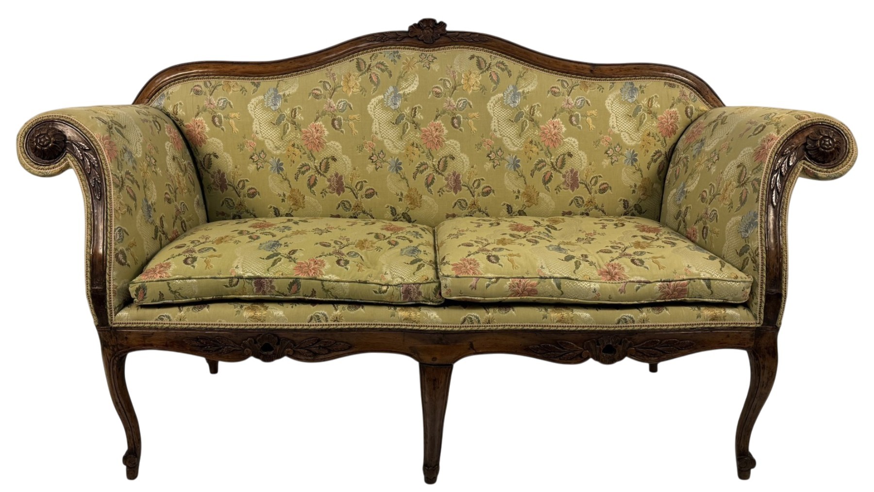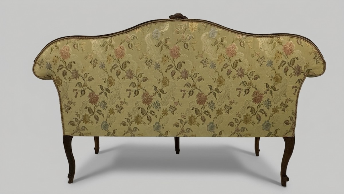 Canapé à oreilles en noyer, Lombardie, XVIIIe siècle, dossier incurvé orné d'une fleur centrale entre deux branches feuillues, motif repris sur la ceinture ; accoudoirs évasés ornés d'une rosace et d'une branche feuillue en cascade ; pieds arqués reposant sur des embouts pointus ; capitonné et recouvert d'un tissu à fleurs polychromes sur fond vert clair, 101 x 181 x 68 cm